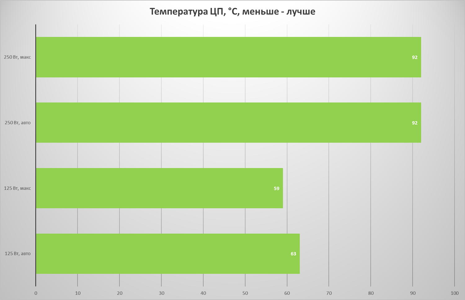 При 125 Вт нагрузке, если доверить управление скоростью работы вентилятора материнской плате, температура достигла отметки 63°С при скорости вентилятора менее 1100 об/мин. При нагрузке 250 Вт скорость работы вентилятора в обоих случаях была максимальной — до 2200 об/мин (2100-2175 об/мин по данным HWiNFO). В простое скорость вентилятора была примерно одинаковой — около 800 об/мин.