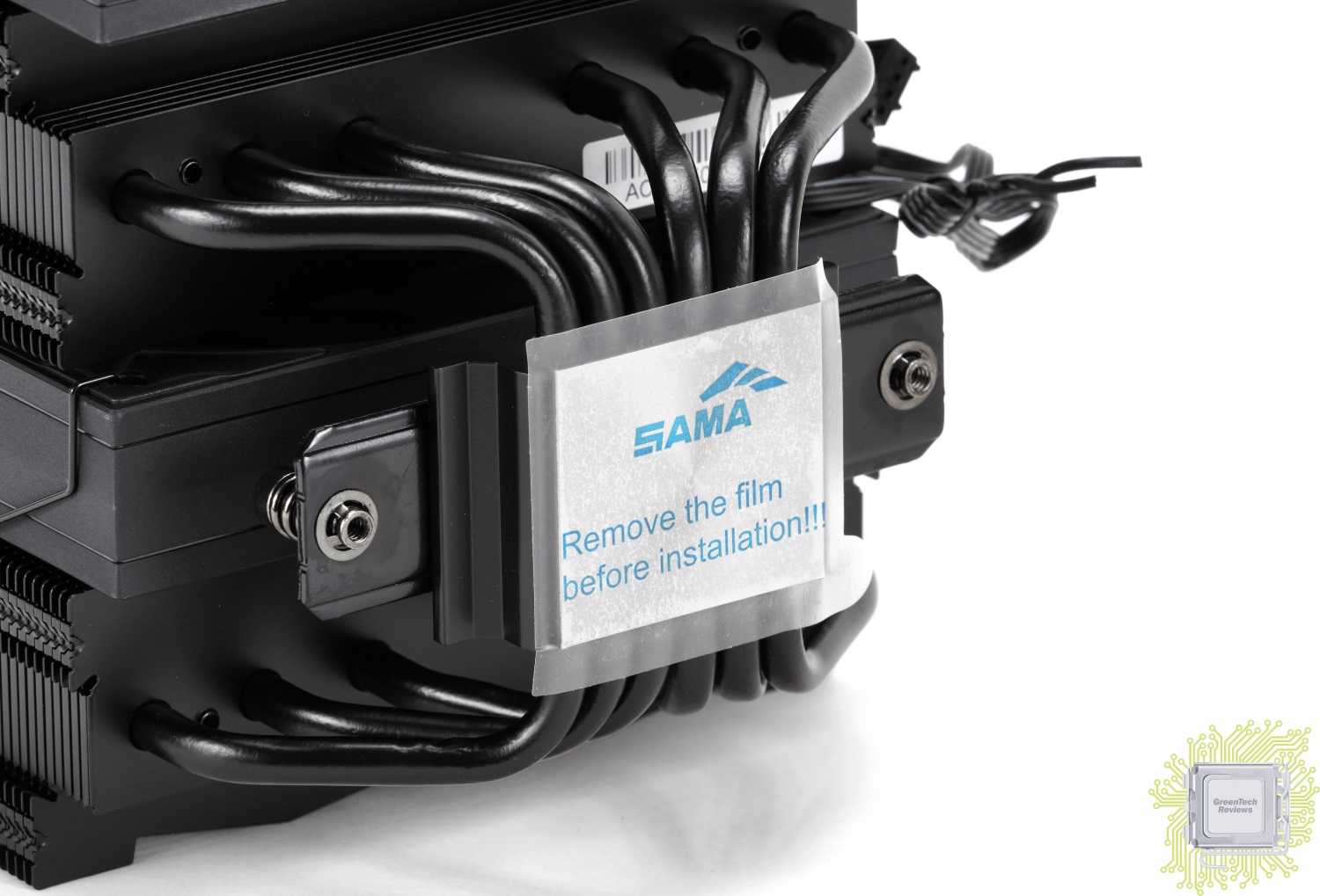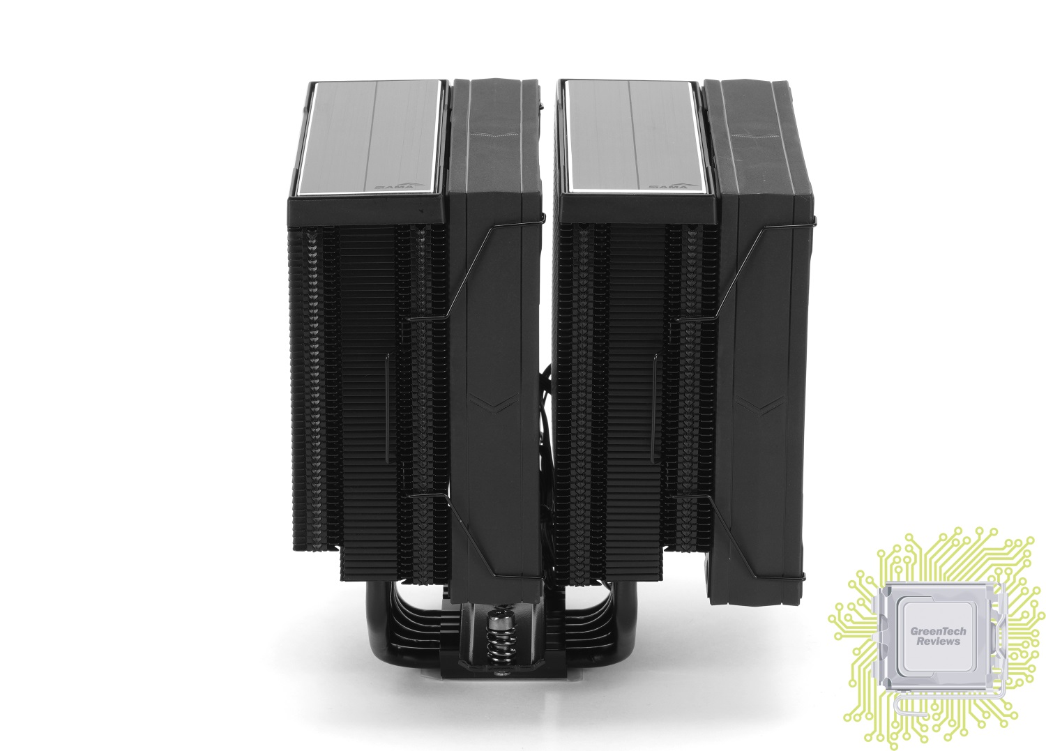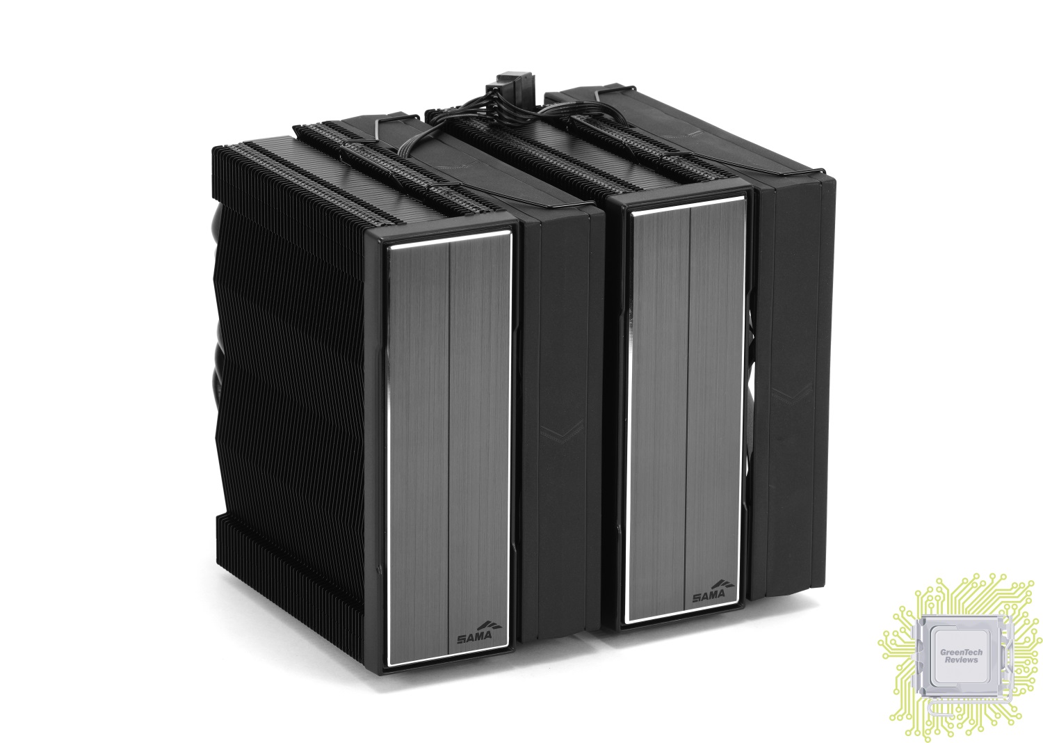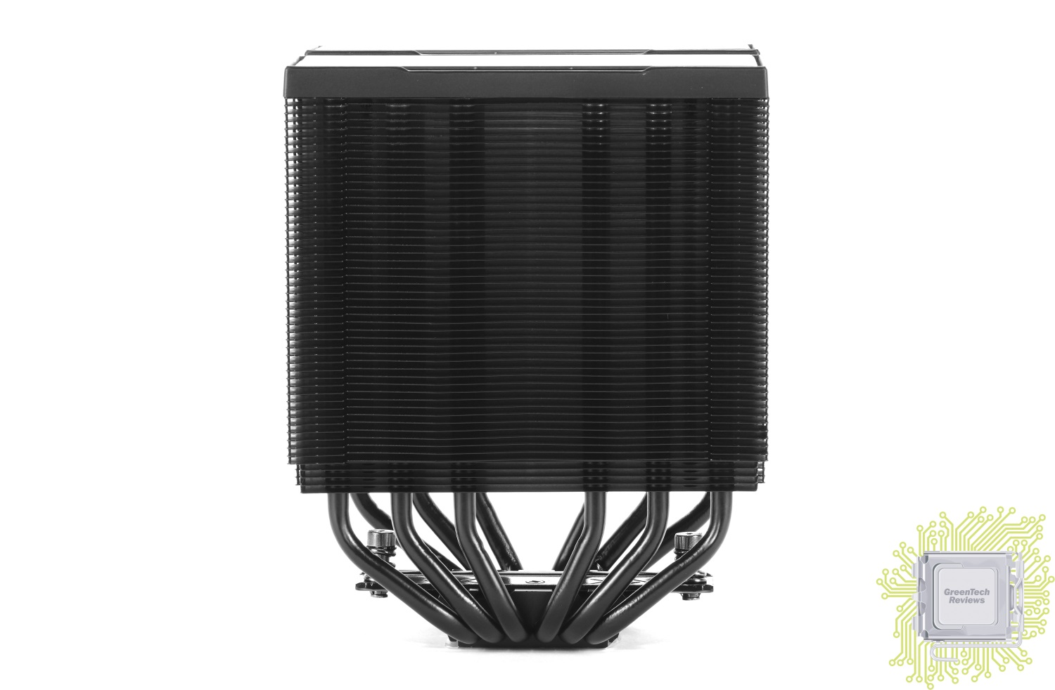 И вот таким образом выглядит SAMA A60, а именно — модификация в чёрном цвете A60B. Это U-образный процессорный кулер высотой 156,5 мм, выполненный полностью в чёрном цвете (хотя верхние панельки всё-таки тёмно-серые).