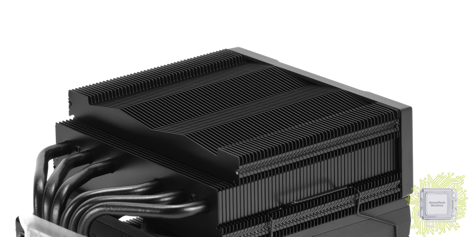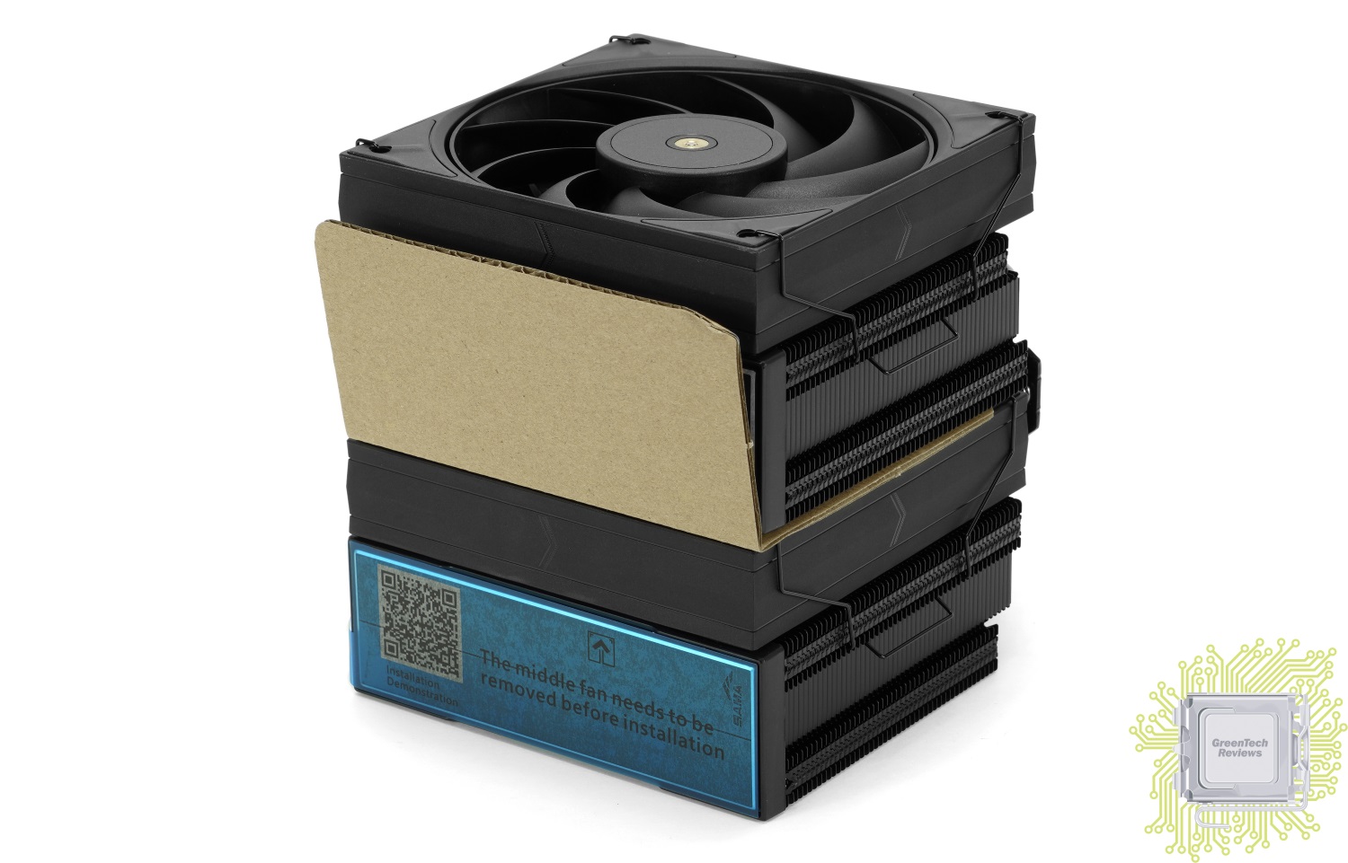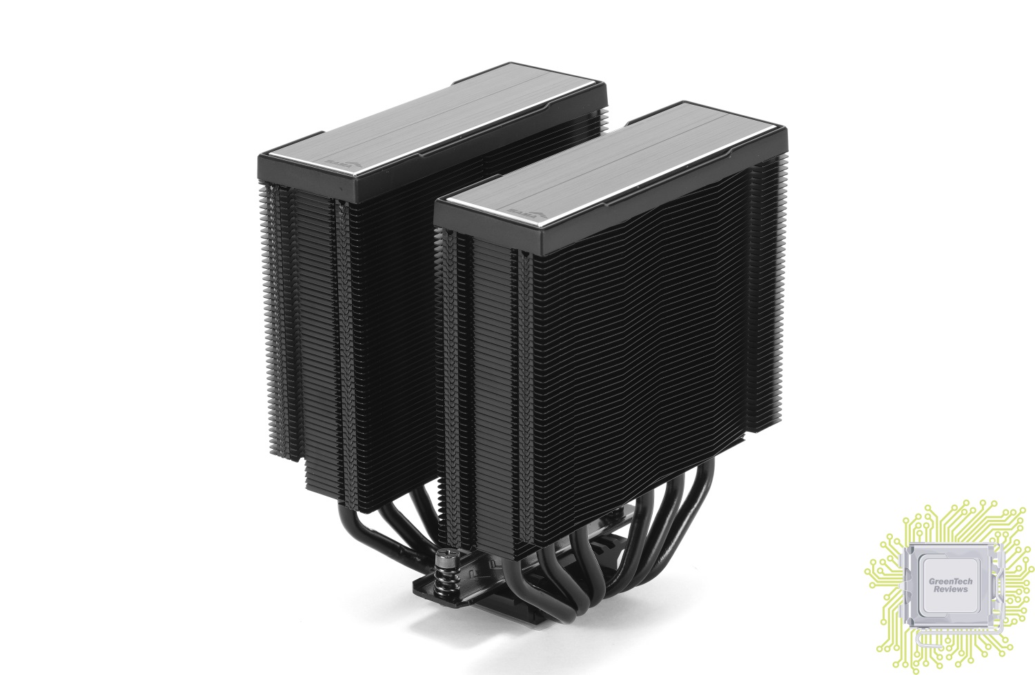 И вот таким образом выглядит SAMA A60, а именно — модификация в чёрном цвете A60B. Это U-образный процессорный кулер высотой 156,5 мм, выполненный полностью в чёрном цвете (хотя верхние панельки всё-таки тёмно-серые).