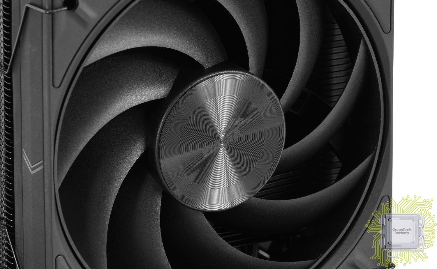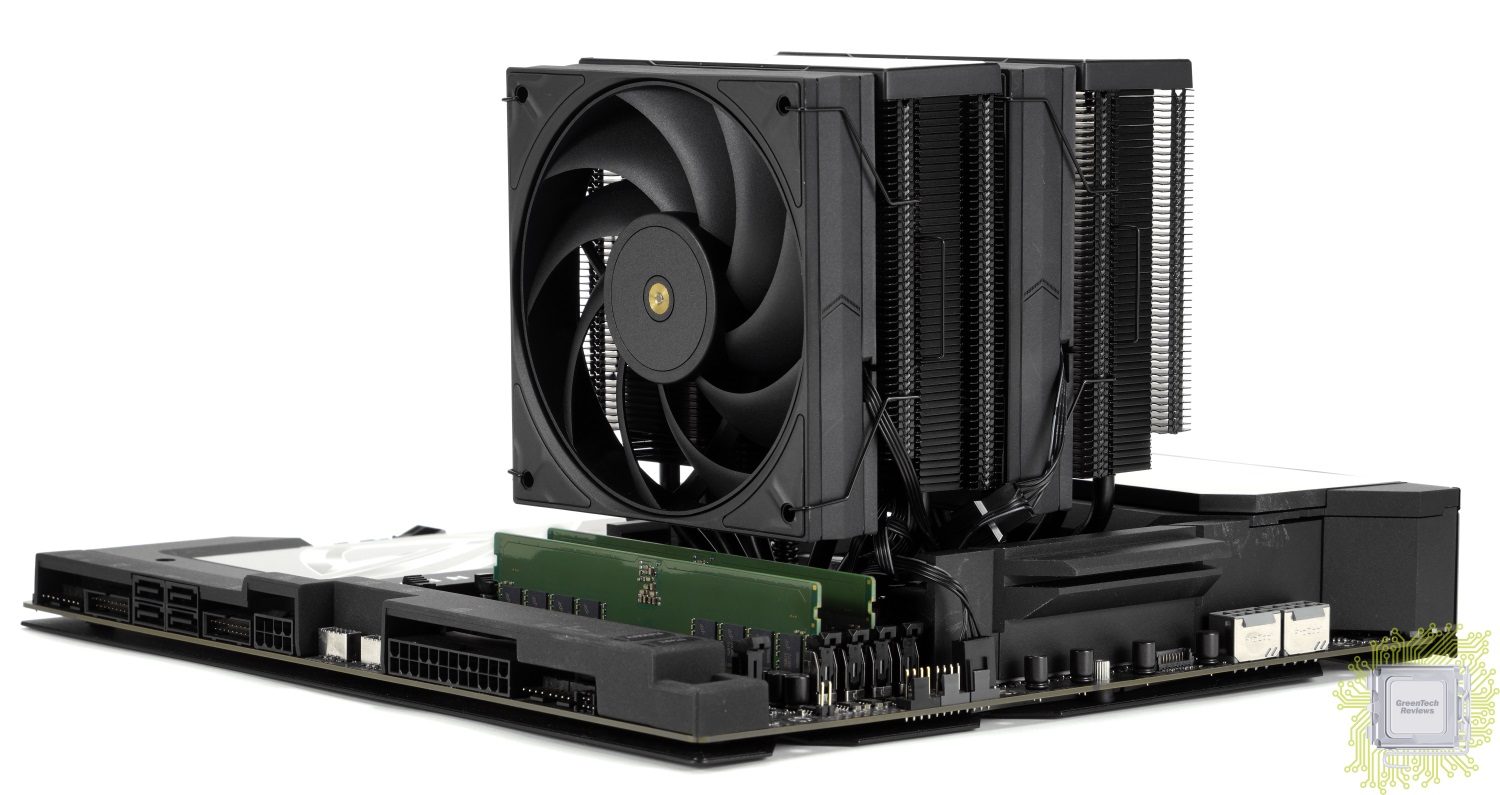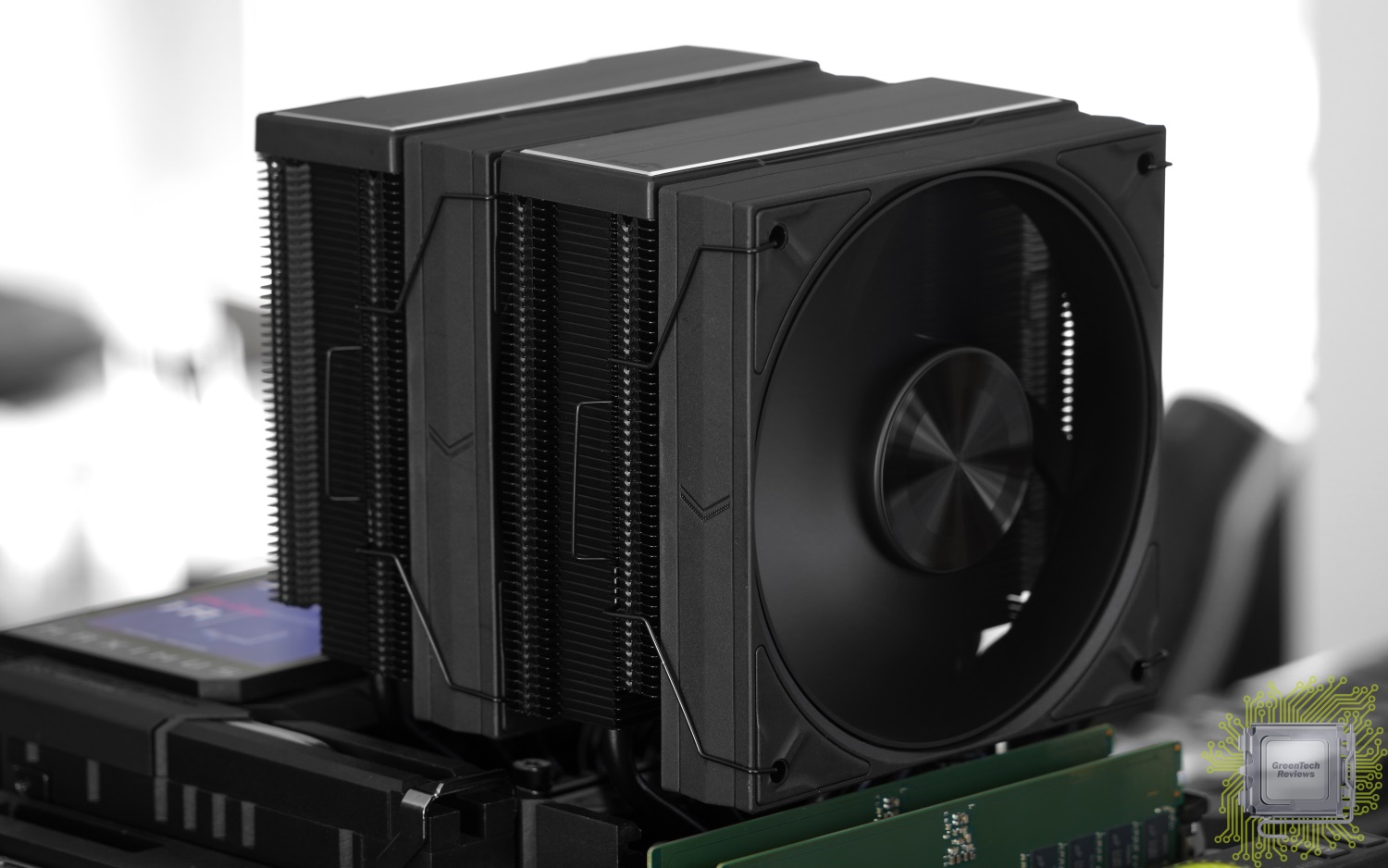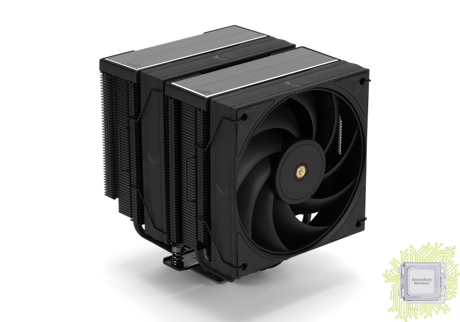 И вот таким образом выглядит SAMA A60, а именно — модификация в чёрном цвете A60B. Это U-образный процессорный кулер высотой 156,5 мм, выполненный полностью в чёрном цвете (хотя верхние панельки всё-таки тёмно-серые).