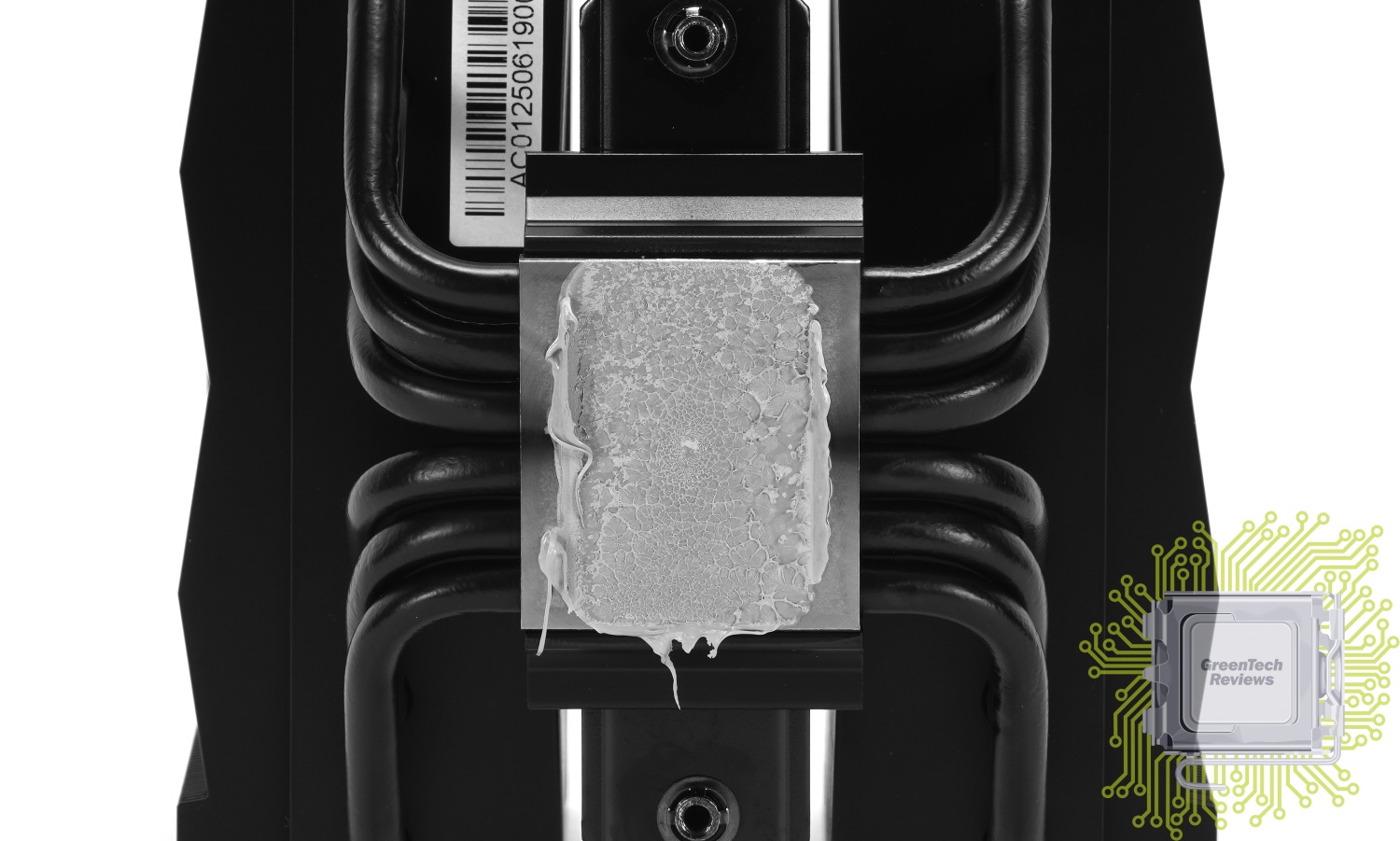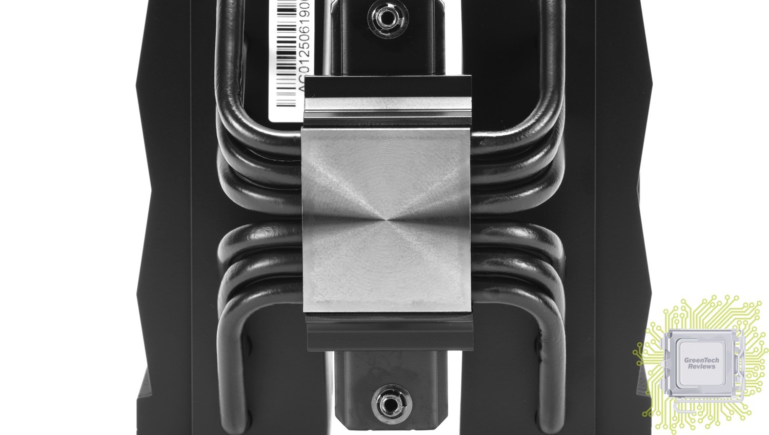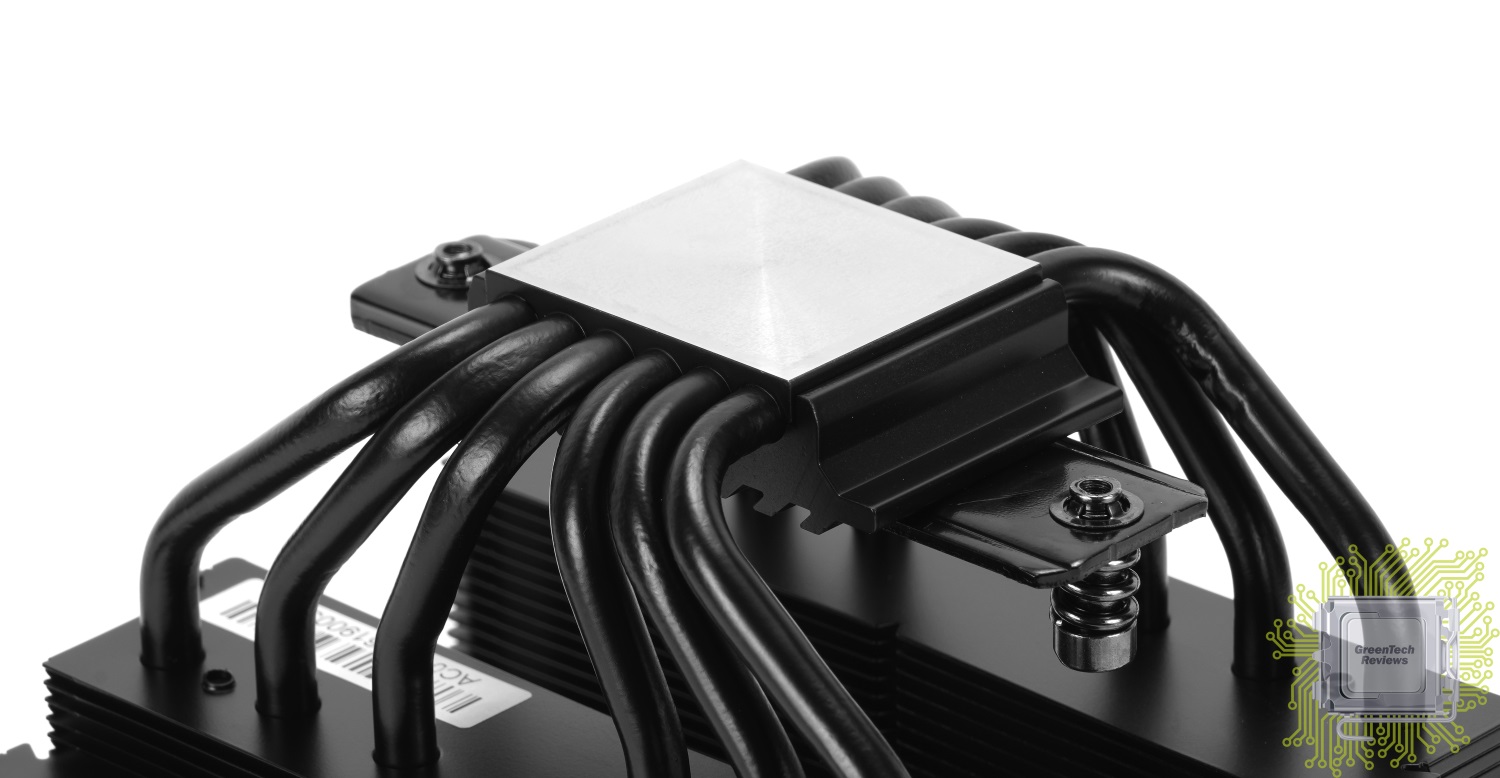 Все шесть тепловых трубок диаметром 6 мм проходят сквозь основание. Конструкция классическая — без прямого контакта тепловых трубок с процессором. Пайка трубок к основанию выполнена очень хорошо.