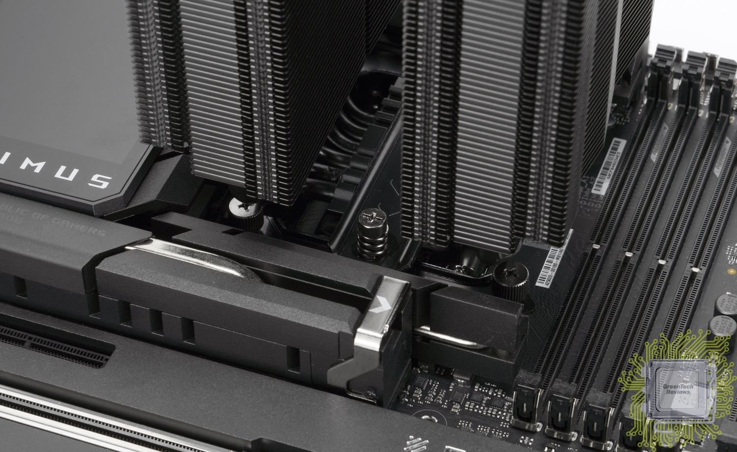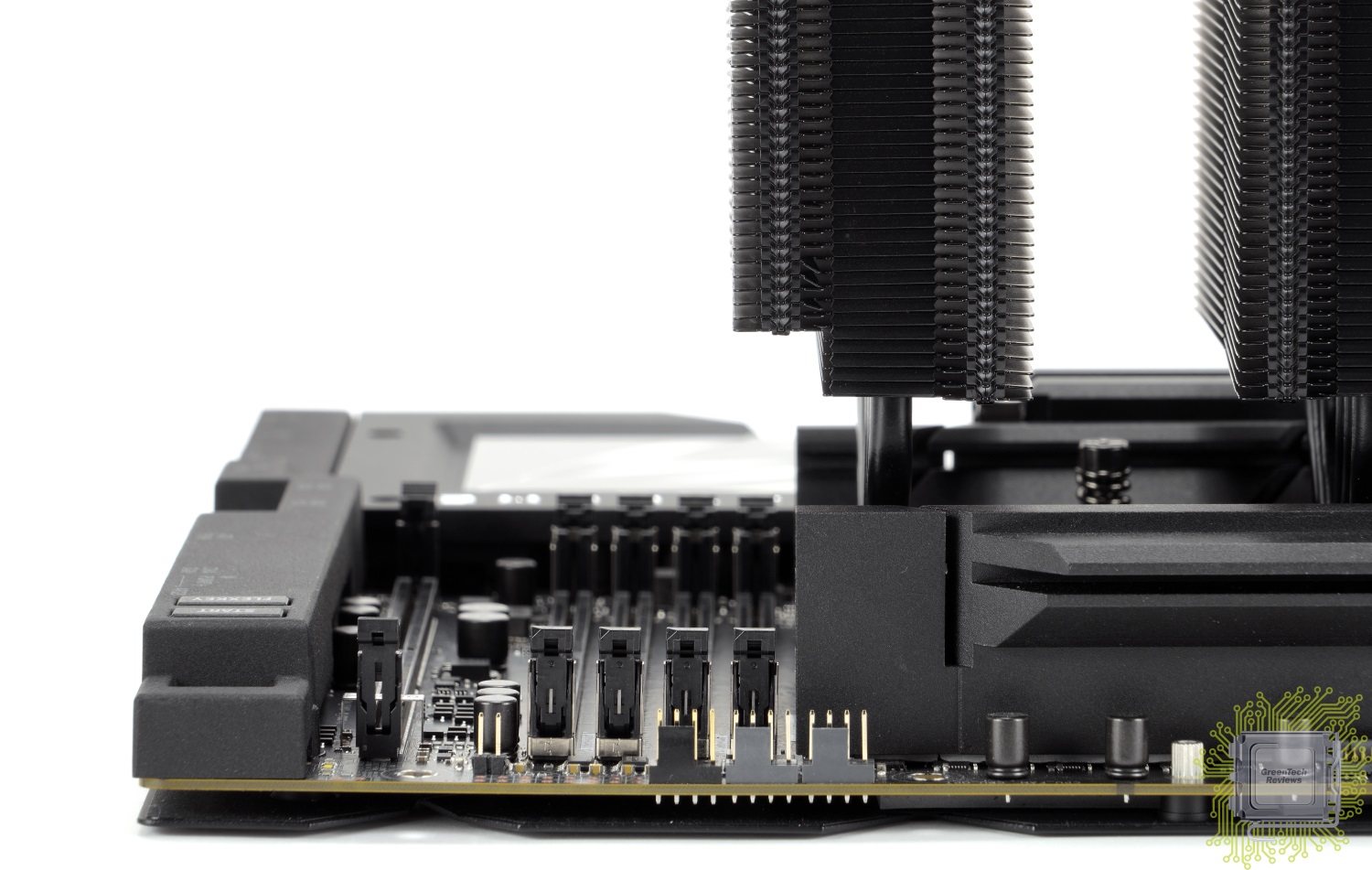 Но и сбоку. Радиаторы снизу характерны уменьшенным количеством теплораспределительных пластин для улучшения совместимости с модулями оперативной памяти.