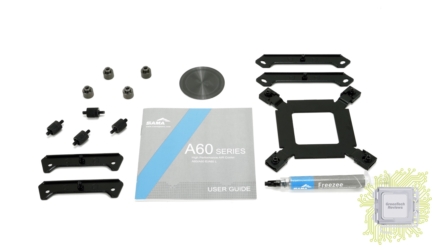 В комплект поставки входят пара вентиляторов, которые уже зафиксированы на радиаторе, и наборы креплений для разных платформ, которые уложены в отдельную коробочку.