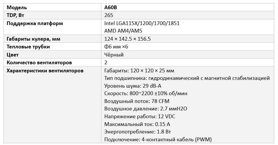 Все основные характеристики кулера расписаны в виде таблицы на задней части коробки.