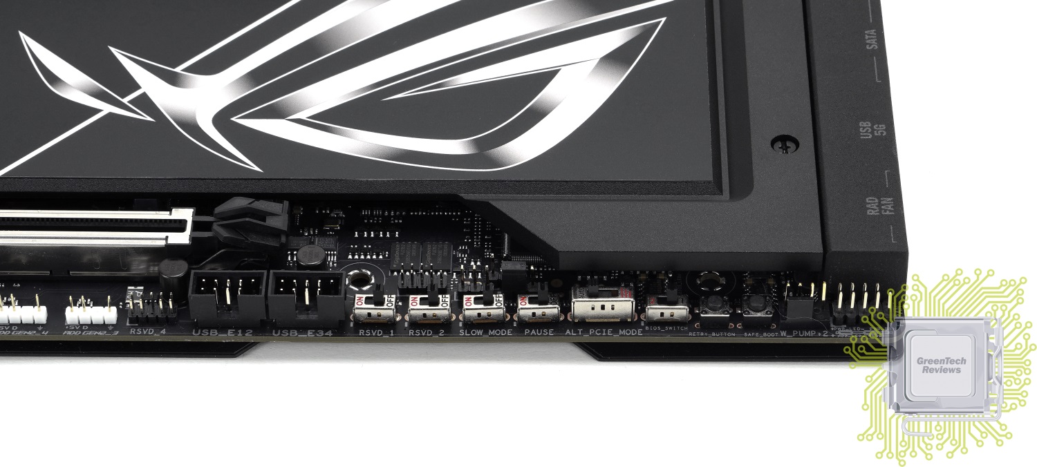 Правее находятся две микросхемы BIOS, несколько переключателей (среди которых Pause, Slow Mode, выбор активной микросхемы BIOS и переключатель режима работы PCIe), кнопки ReTry и SafeBoot, а также разъёмы для подключения помпы СЖО и передней панели корпуса (кнопки и светодиоды).