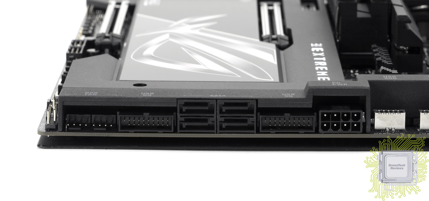 Для подключения SATA устройств доступно четыре порта. Слева и справа от них находится пара колодок для подключения суммарно четырёх USB 3.2 портов. Слева ещё реализованы два 4-контактных разъёма для вентиляторов. А справа — 8-контактный разъём питания (формата PCIe) для реализации быстрой зарядки в одном из Type-C портов, выведенных на переднюю панель. Максимальная мощность в таком случае составляет 60 Вт (QC4+).