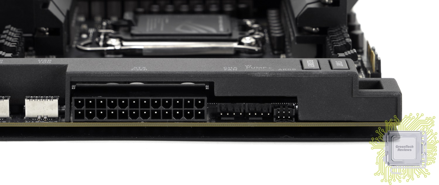 Справа от 24-контактного разъёма питания размещены два коннектора для вентиляторов (4-контактные) и разъём для подключения кабеля-переходника из комплекта поставки для подключения RGB устройств с питанием 12 В.