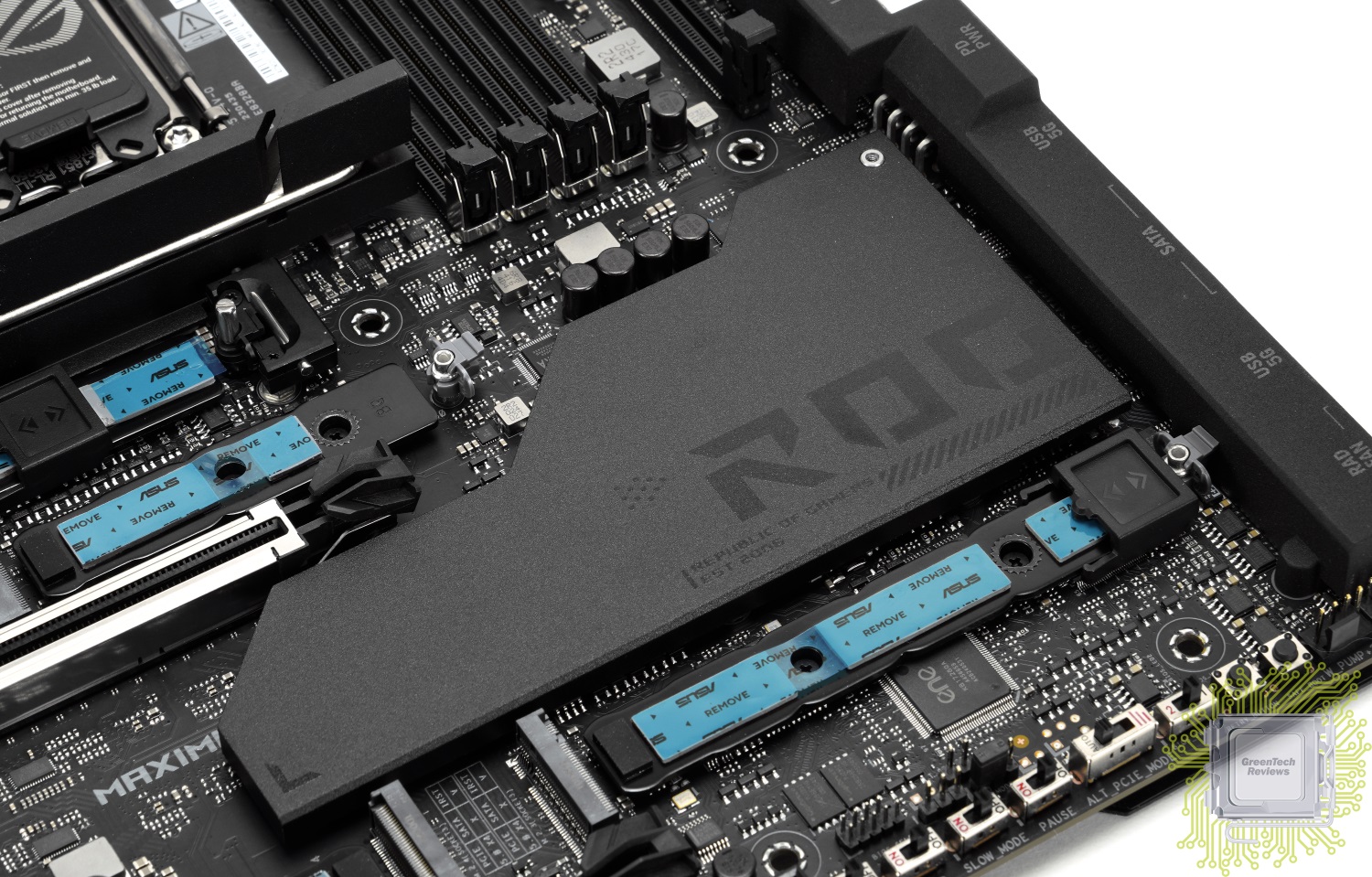Непосредственно на самой плате для установки M.2 SSD-накопителей доступны четыре разъёма. Один из них скрыт своим собственным радиатором. Ещё три закрыты собственным металлическим радиатором.