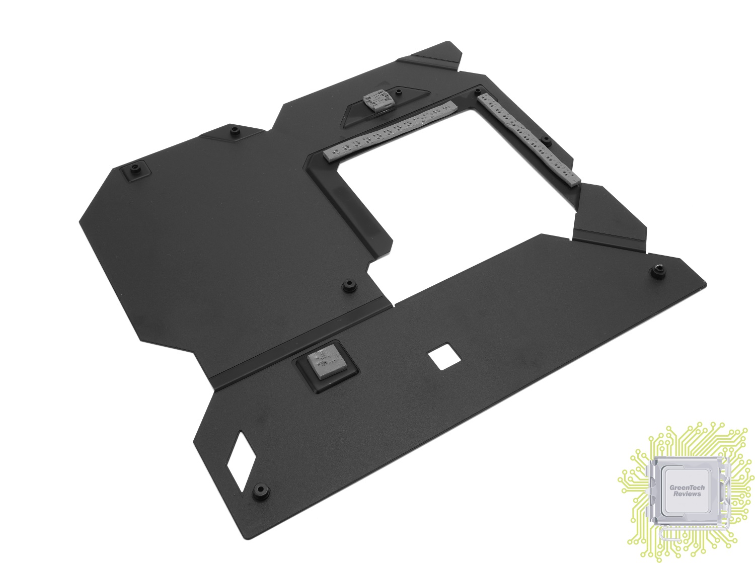 Наибольшую площадь обратной стороны платы закрывает массивная металлическая пластина, которая играет не только роль усилителя конструкции, но и компонента системы охлаждения.