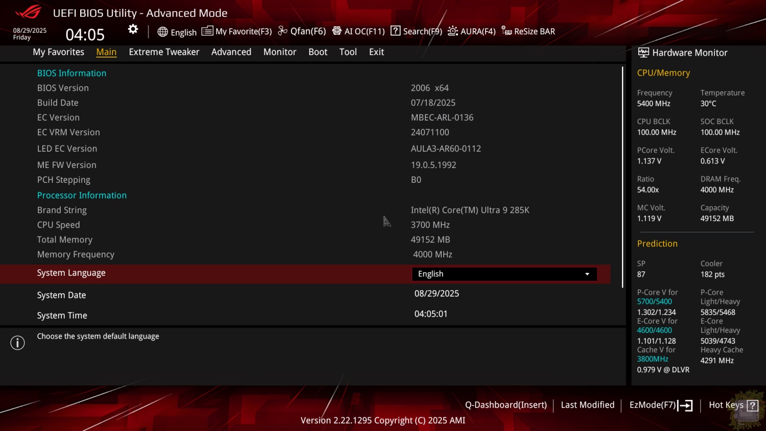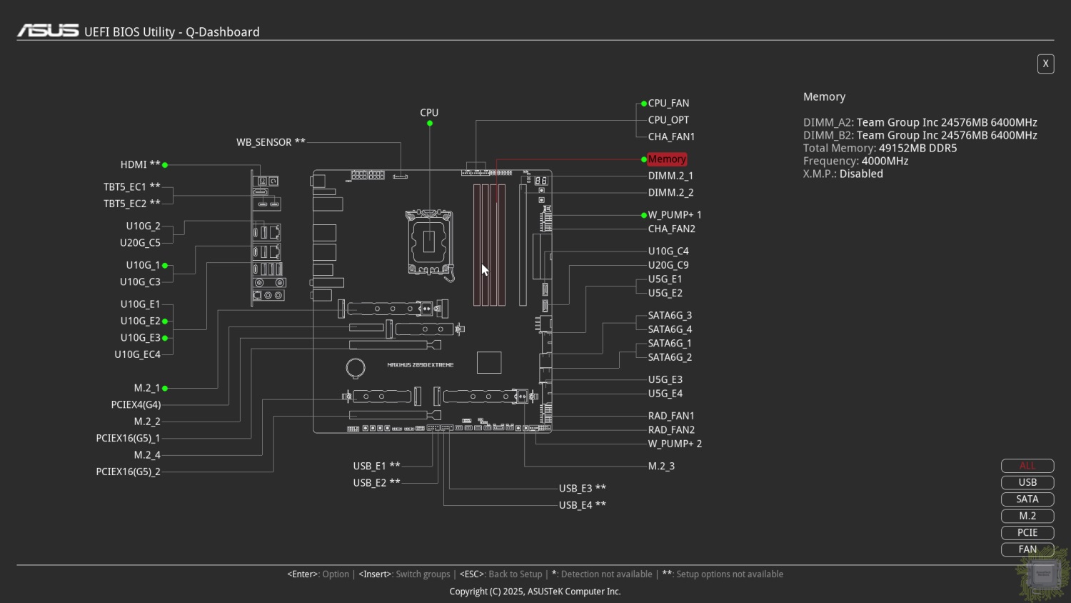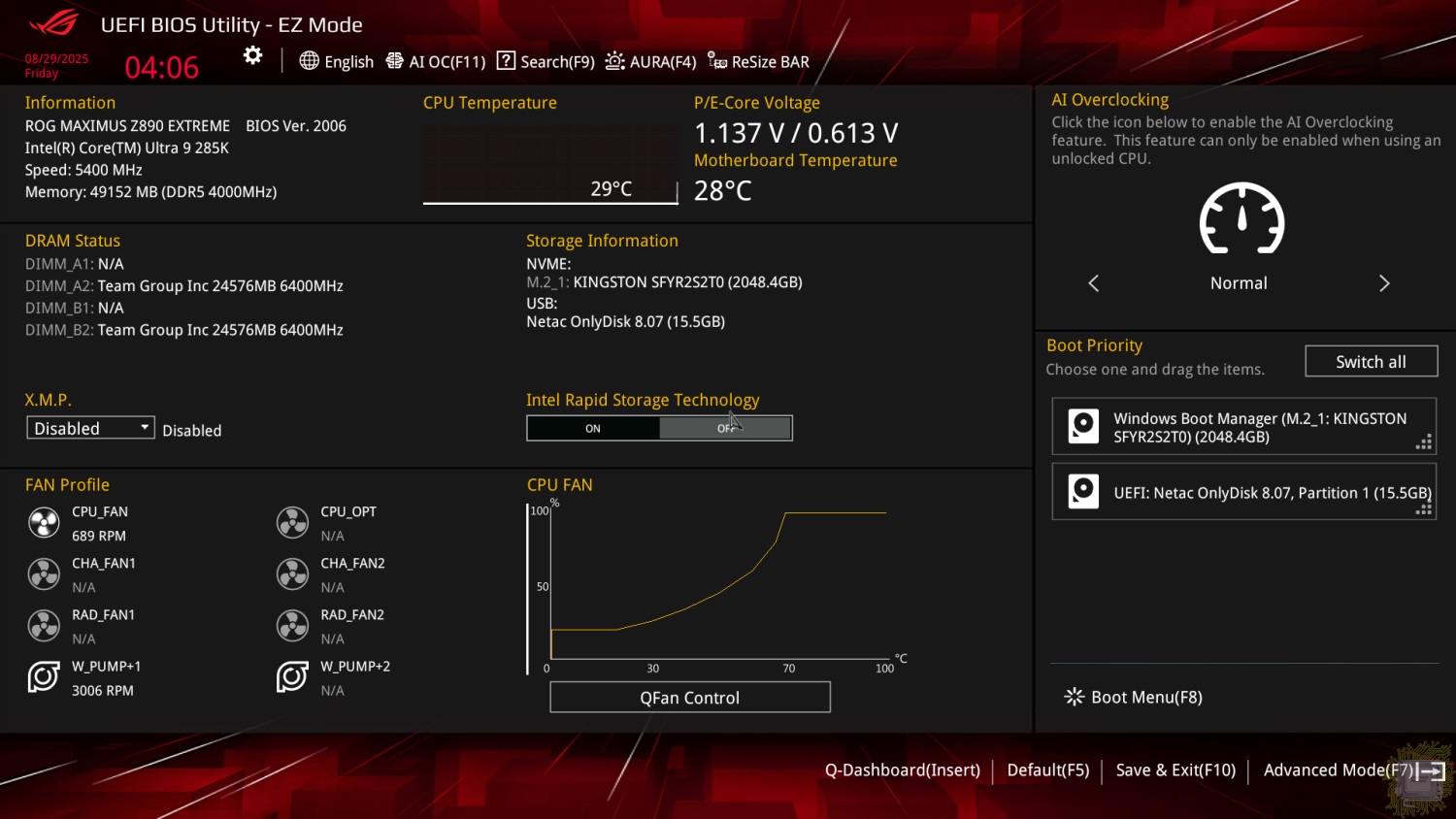 Упрощённый режим (EZ Mode) встречает нас экраном, на котором показана основная информация о подключённых устройствах — память, SATA-накопители, вентиляторы, процессор, а также температура и напряжение процессора, скорости вращения вентиляторов и режим работы системы.