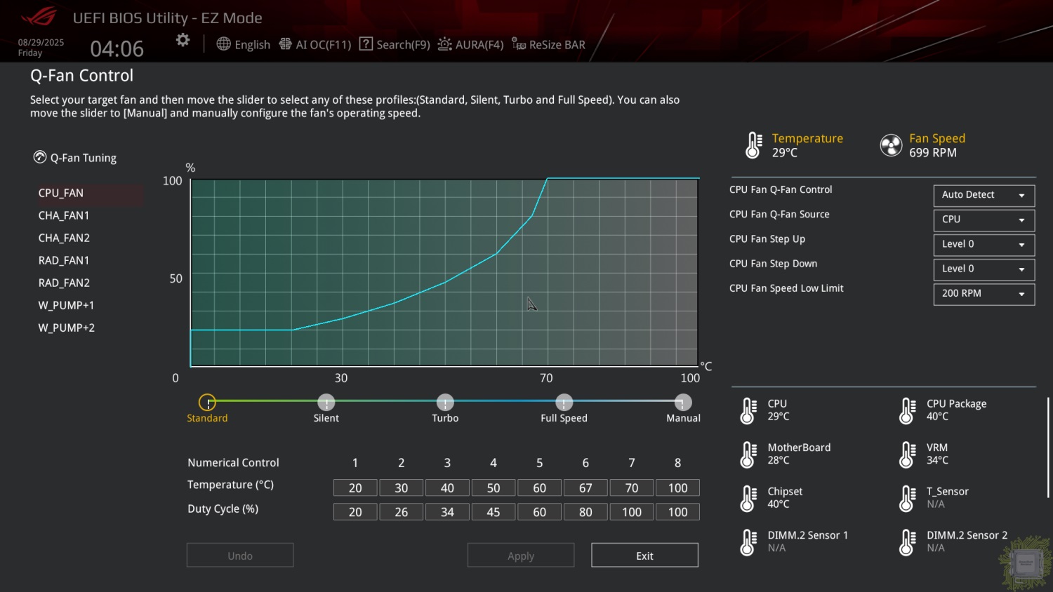 По нажатию кнопки Q-Fan Control (кнопка F6) появляется график настройки пяти вентиляторов и двух помп для системы жидкостного охлаждения.