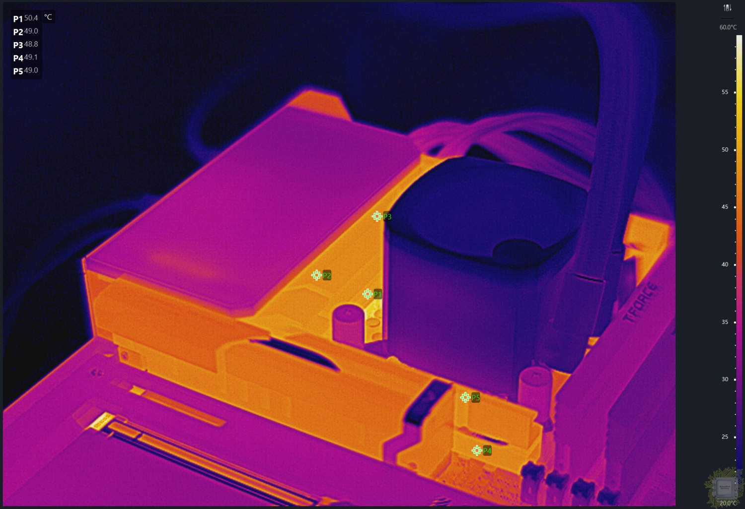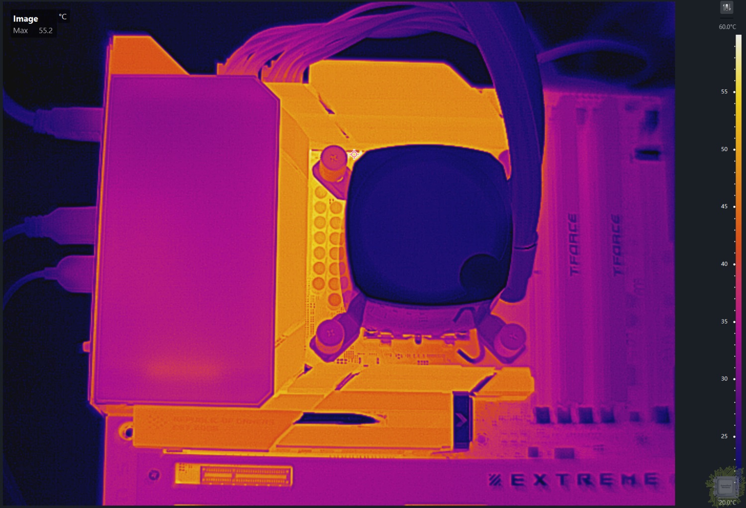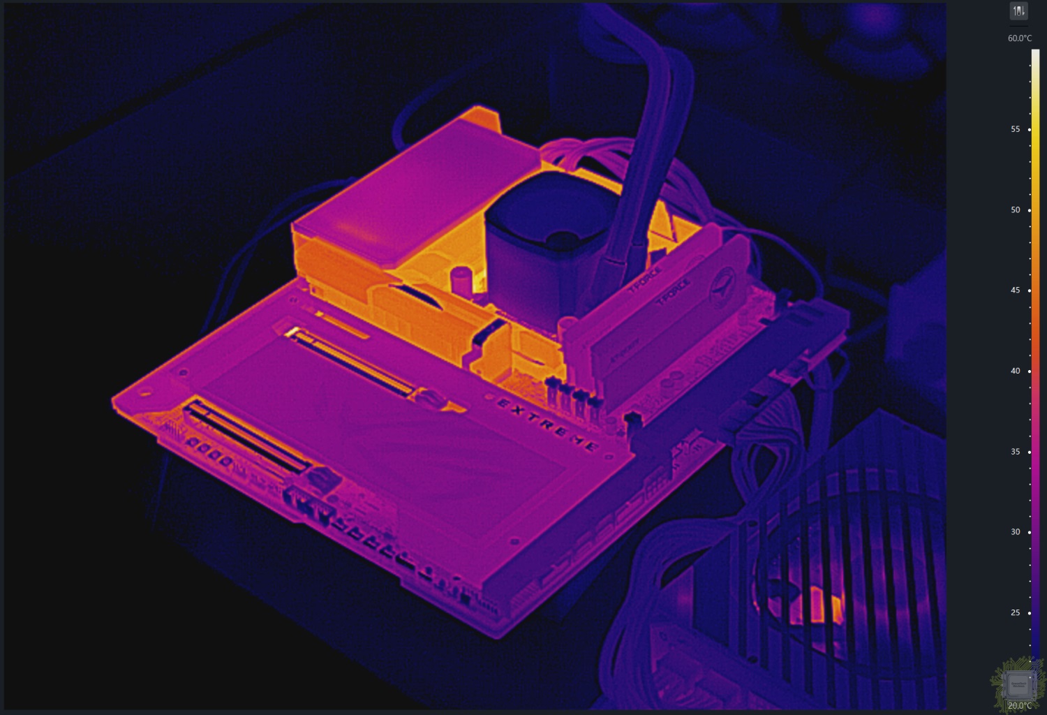 Теперь самое интересное — о температуре подсистемы питания. Напомним, что от процессора тепло отводится системой жидкостного охлаждения. Энергопотребление процессора на момент тестирования составляло почти 300 Вт.