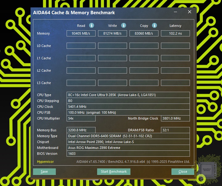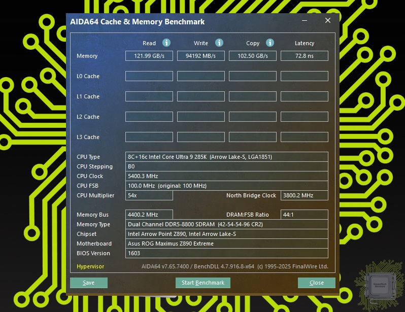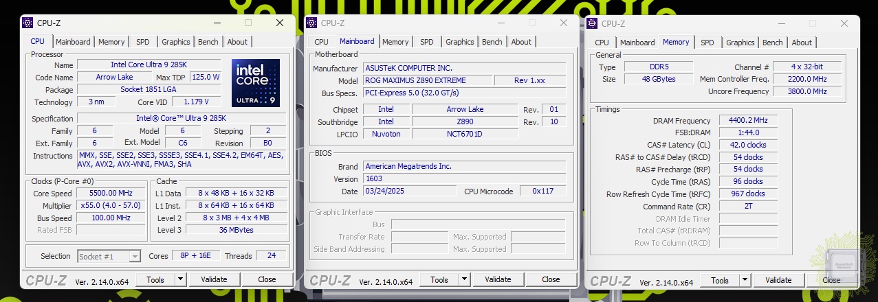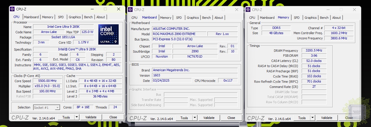 Для тестирования был взят процессор Core Ultra 9 285K и память DDR5 с XMP профилем 8800 МТ/с и возможностью разгона до 9600 МТ/с. Отвод тепла от процессора обеспечивала система жидкостного охлаждения. Сначала — номинальный режим работы процессора и памяти.