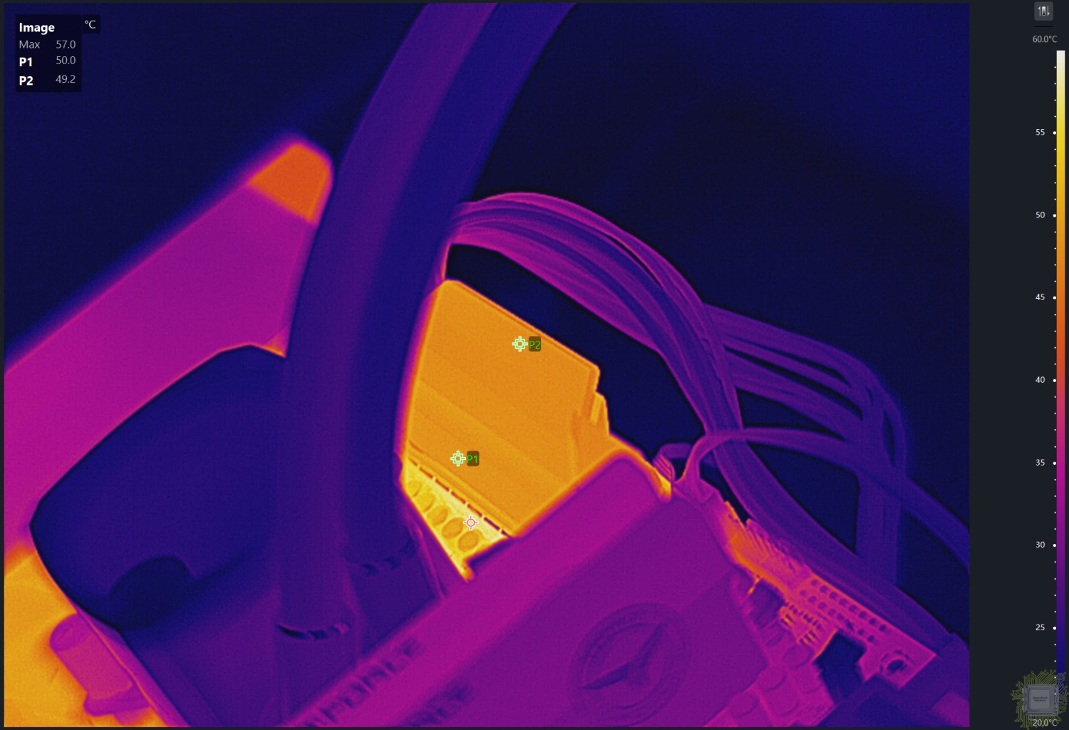 Левая часть радиатора прогрелась примерно до 50°С в зависимости от места фиксации температуры.