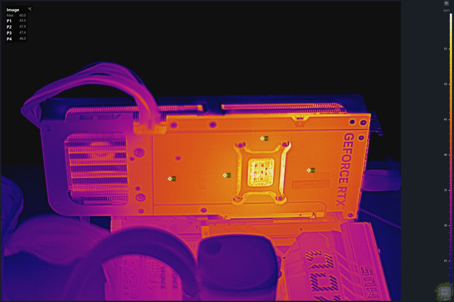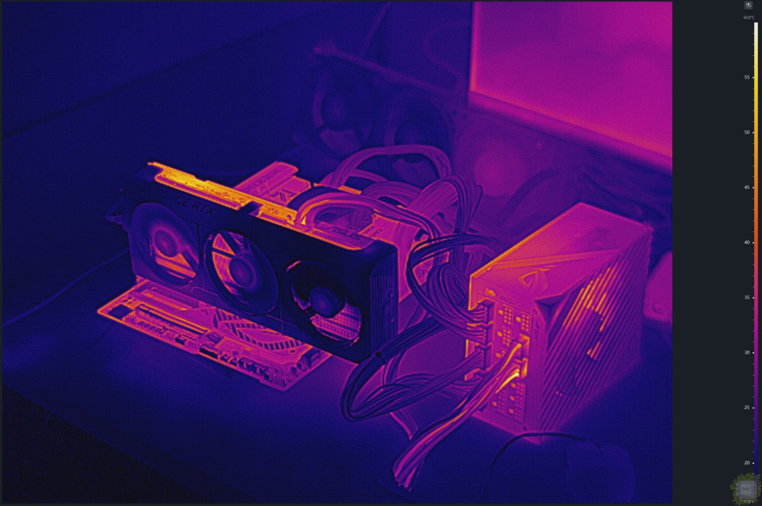 Если посмотреть на видеокарту тепловизором, то картина складывается следующая. Общий вид на тестовый стенд: