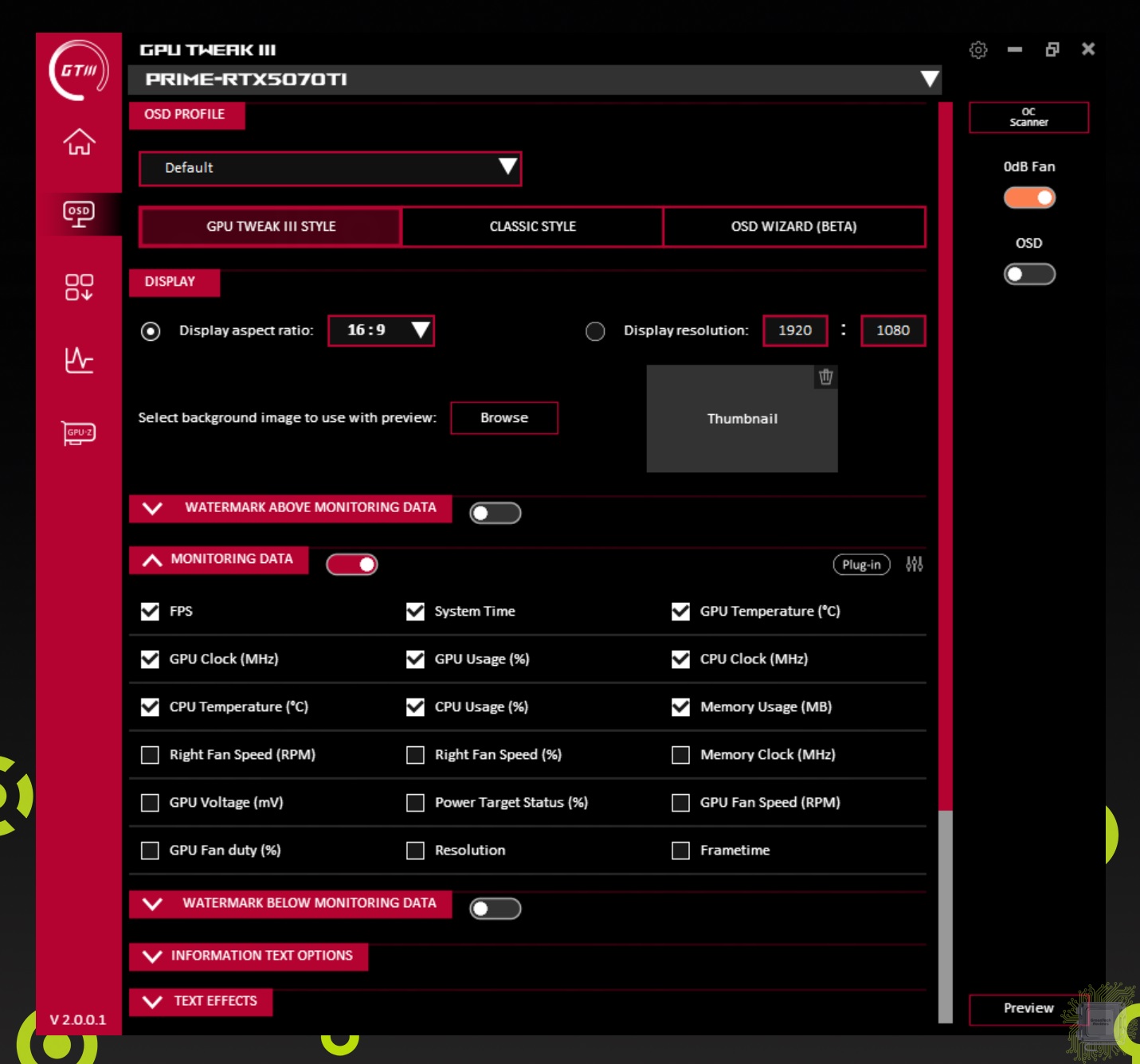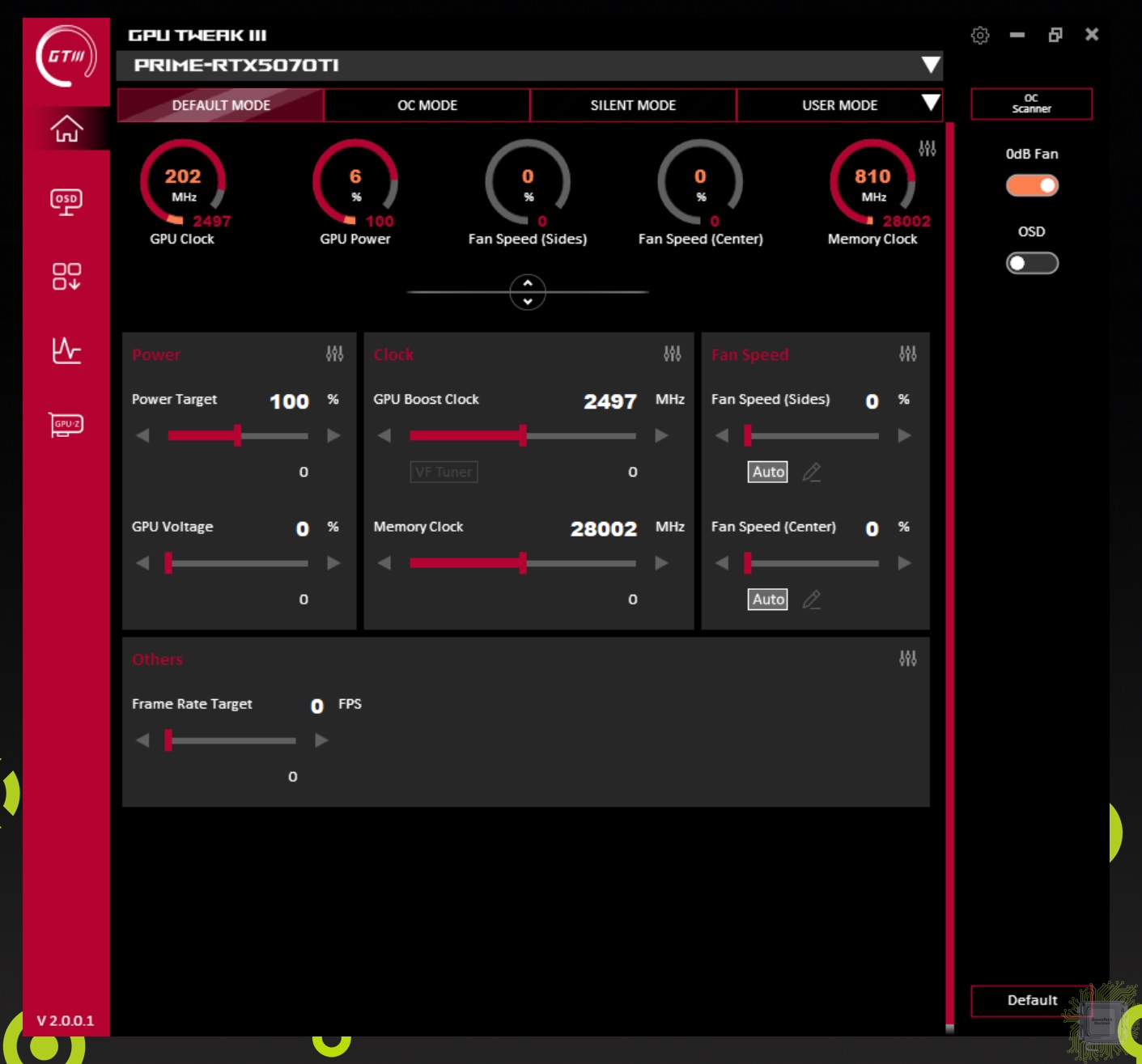 Для работы непосредственно с видеокартой реализовано фирменное программное обеспечение GPU Tweak III, которое позволяет удобно работать с видеокартой — доступен ручной разгон, несколько предустановленных профилей и функция автоматического разгона. По сравнению с предыдущей версией, интерфейс был полностью обновлён и стал куда более удобным.