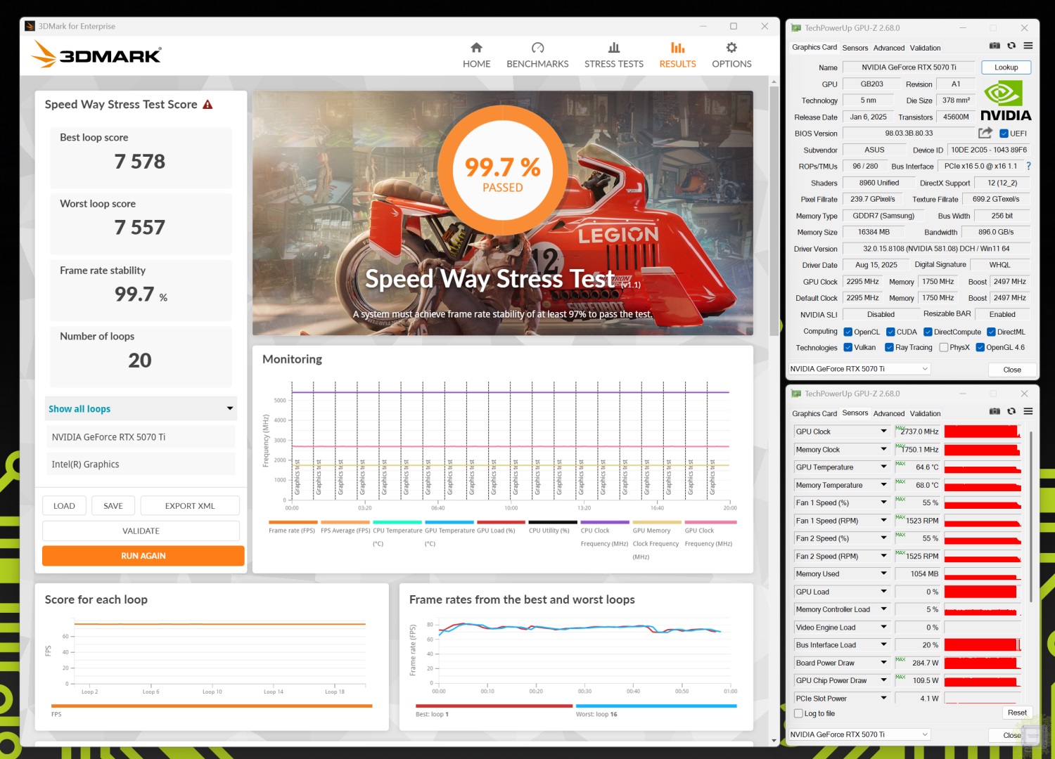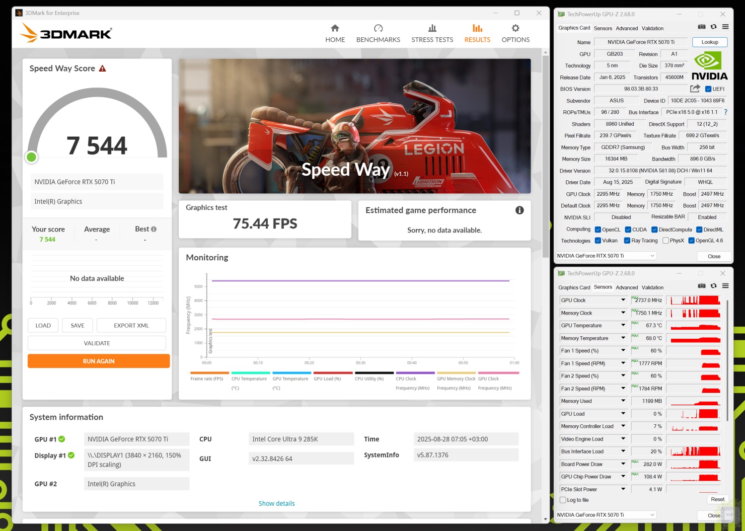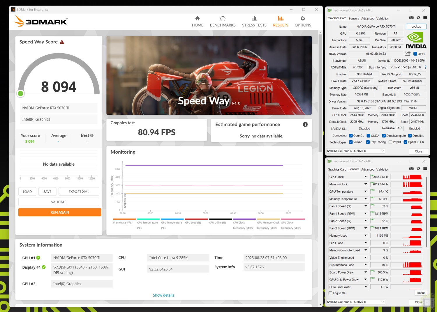 Пример замера производительности в графическом тесте 3DMark Speed Way. Номинальный режим. Частота графического процессора достигает 2737 МГц при TDP видеокарты в районе 280 Вт.