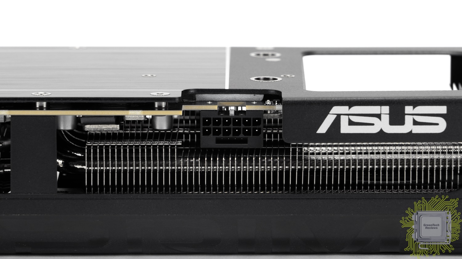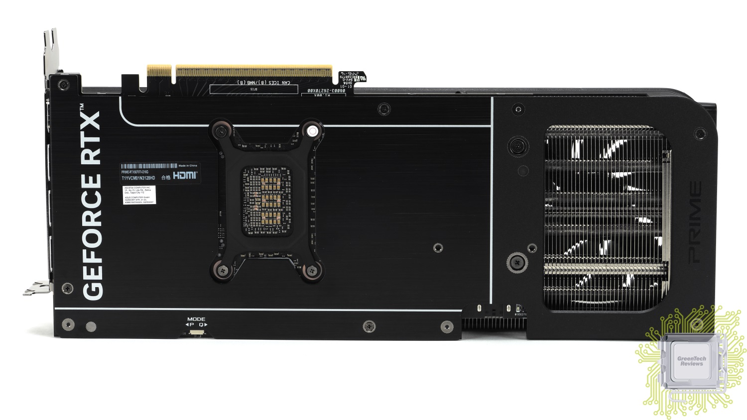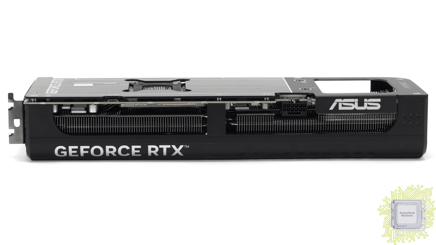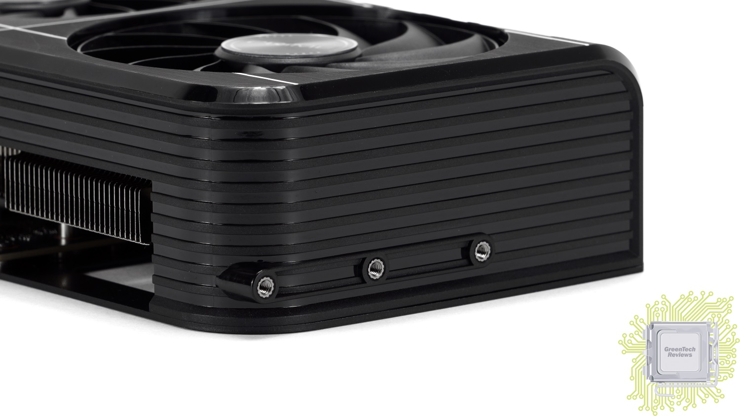 Практически всю обратную сторону печатной платы закрывает металлический бэкплейт с названием серии видеокарты и серии, к которой она принадлежит. Вне печатной платы в бэкплейте реализовано «окно», чтобы радиатор продувался насквозь, тёплый воздух поднимался и выдувался корпусными вентиляторами за пределы корпуса.