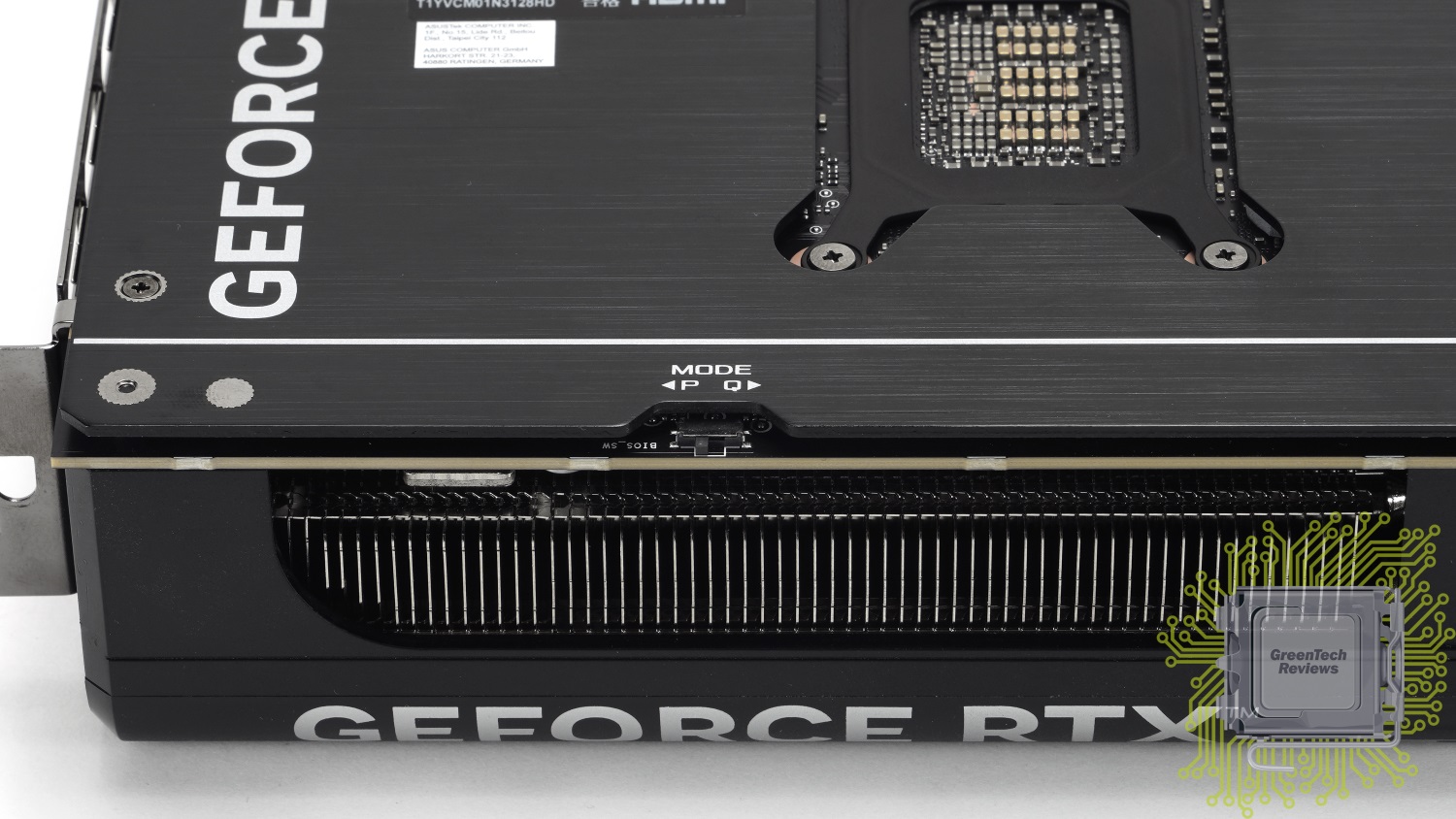 Неподалёку от упомянутого выше переключателя расположен переключатель микросхем BIOS видеокарты, в которых загружены разные профили — максимальная производительность или низкий уровень шума.