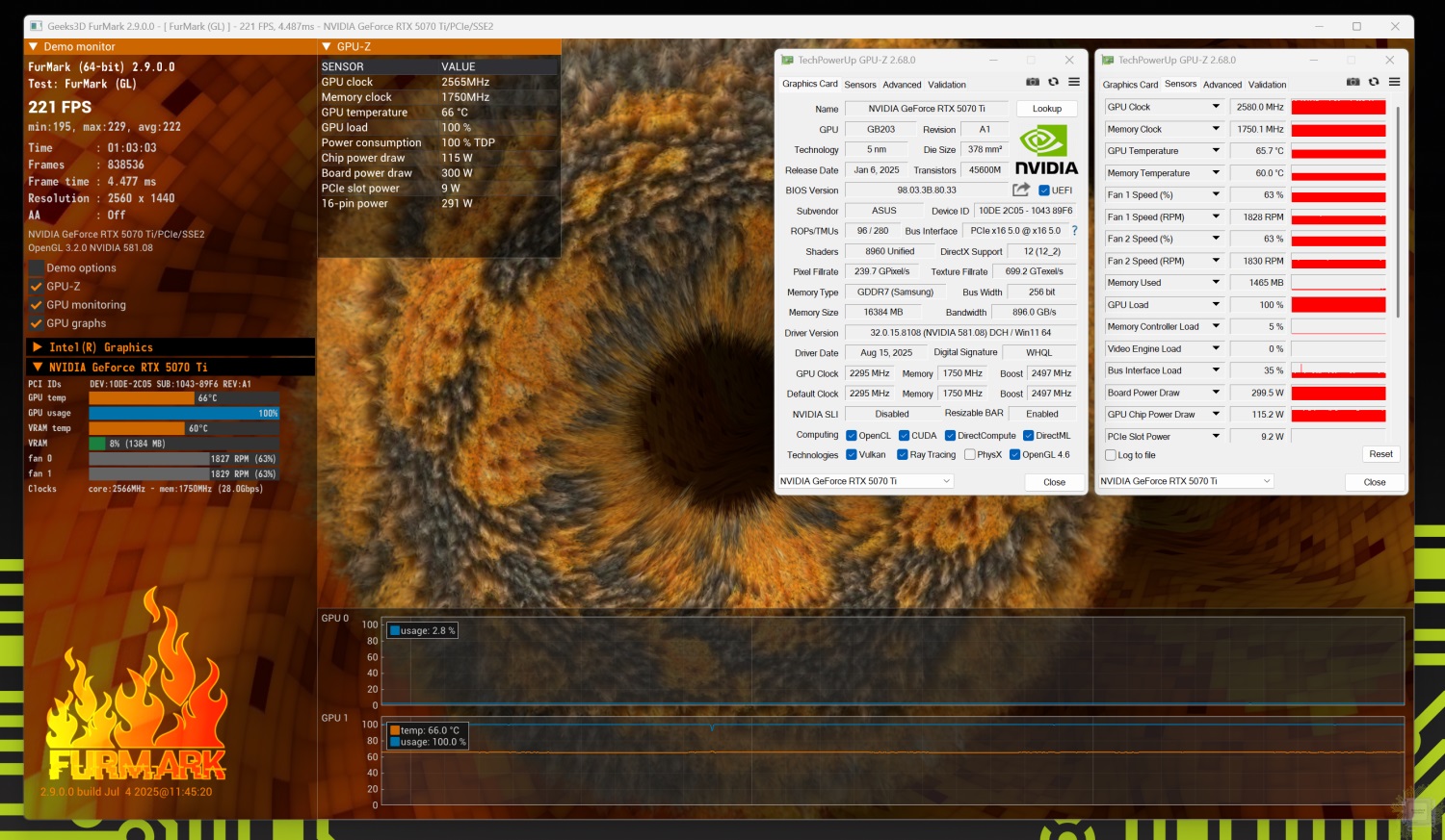 По разгону ситуация следующая. При помощи GPU Tweak III удалось добиться работы видеокарты на частоте 2985 МГц для графического процессора и 2013 МГц (32,2 ГГц) для видеопамяти. Прирост производительности в таком режиме составляет до 10% в зависимости от сценария использования видеокарты. Энергопотребление в таком режиме возросло со 280 Вт до 305 Вт (вся видеокарта).