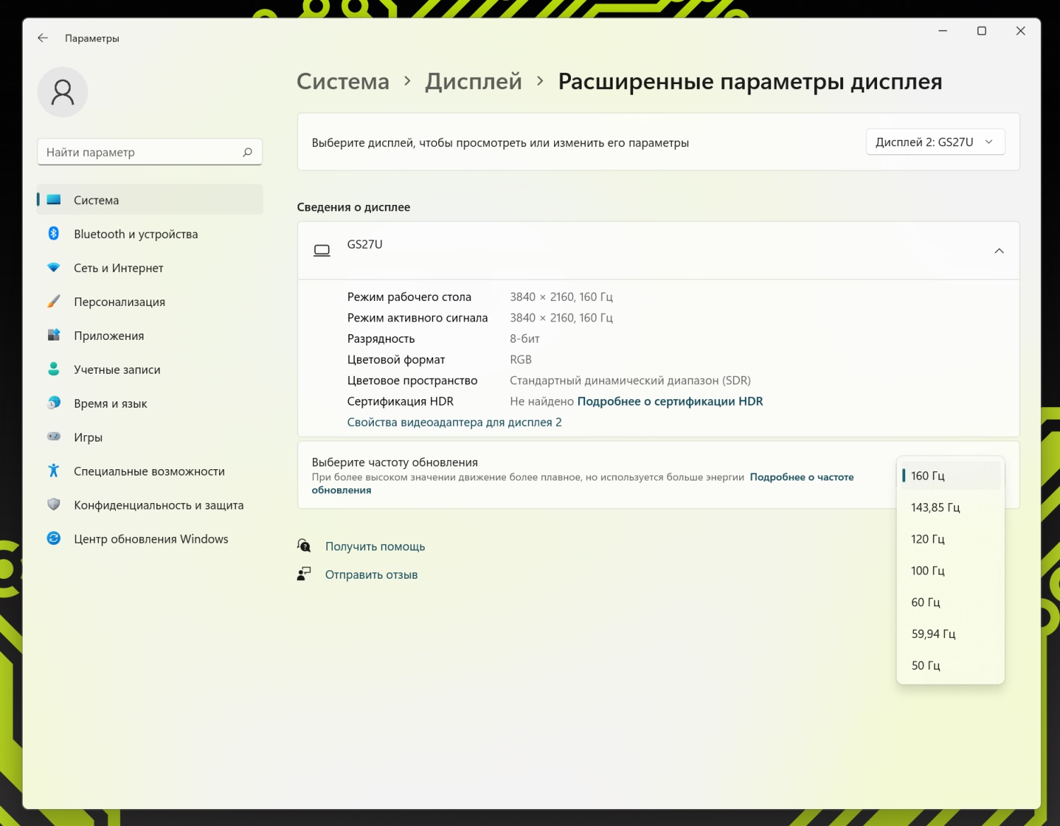 В отличие от практически всех остальных мониторов производителя, модель GS27U позволяет выбрать частоту обновления в достаточно большом диапазоне значений — от 50 до 160 Гц.