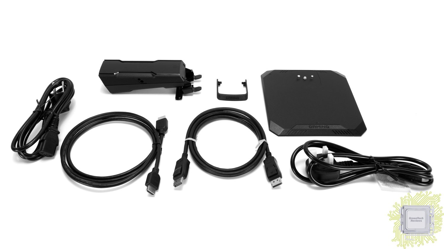 Комплект поставки включает в себя руководство пользователя, силовой кабель, DisplayPort и HDMI кабели, подставку в разобранном виде и фиксатор для кабелей, который крепится к вертикальной части подставки.