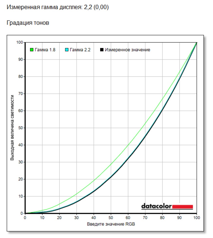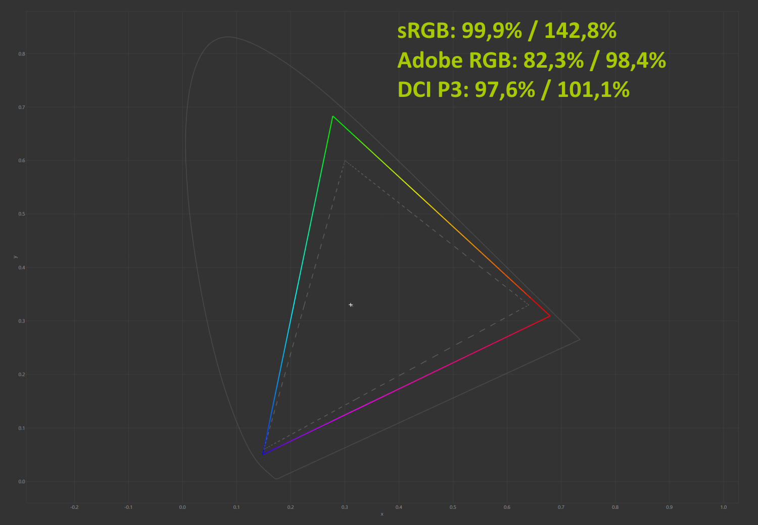 При стандартных настройках дисплей соответствует sRGB на 99% (полный охват — 142,8%), Adobe RGB на 82,3% (полный охват — 98,4%) и DCI P3 на 97,6% (полный охват — 101,1%).
