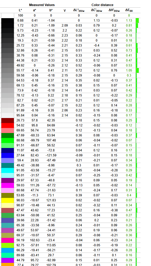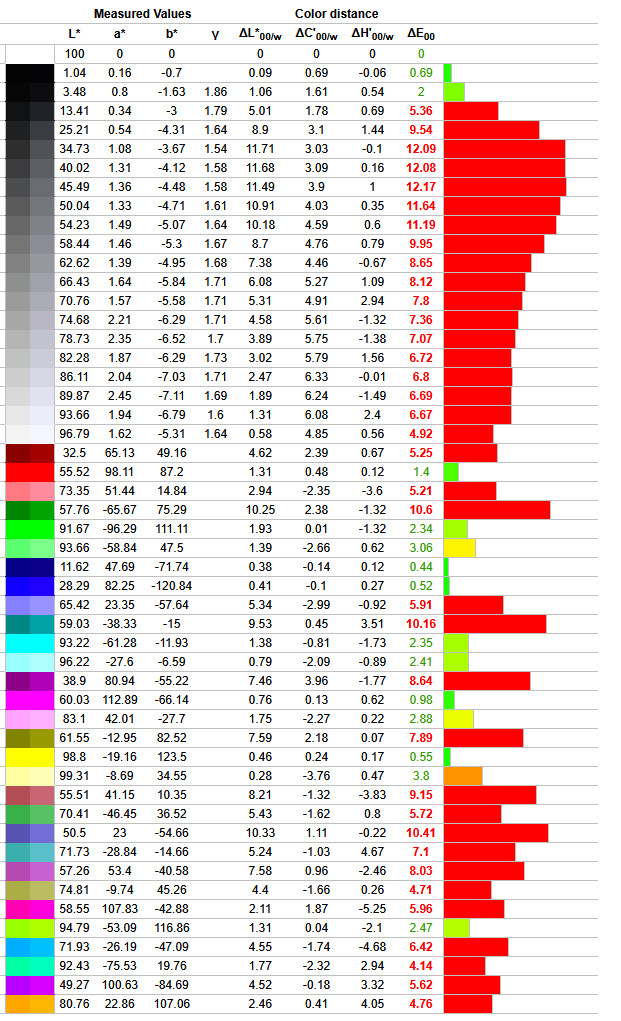 Что касается отклонений цветопередачи, то мы получили такие результаты. Напомним, что очень хорошими результатами являются показатели отклонения DeltaE (среднее значение) менее единицы, а максимальное отклонение DeltaE – менее трёх.