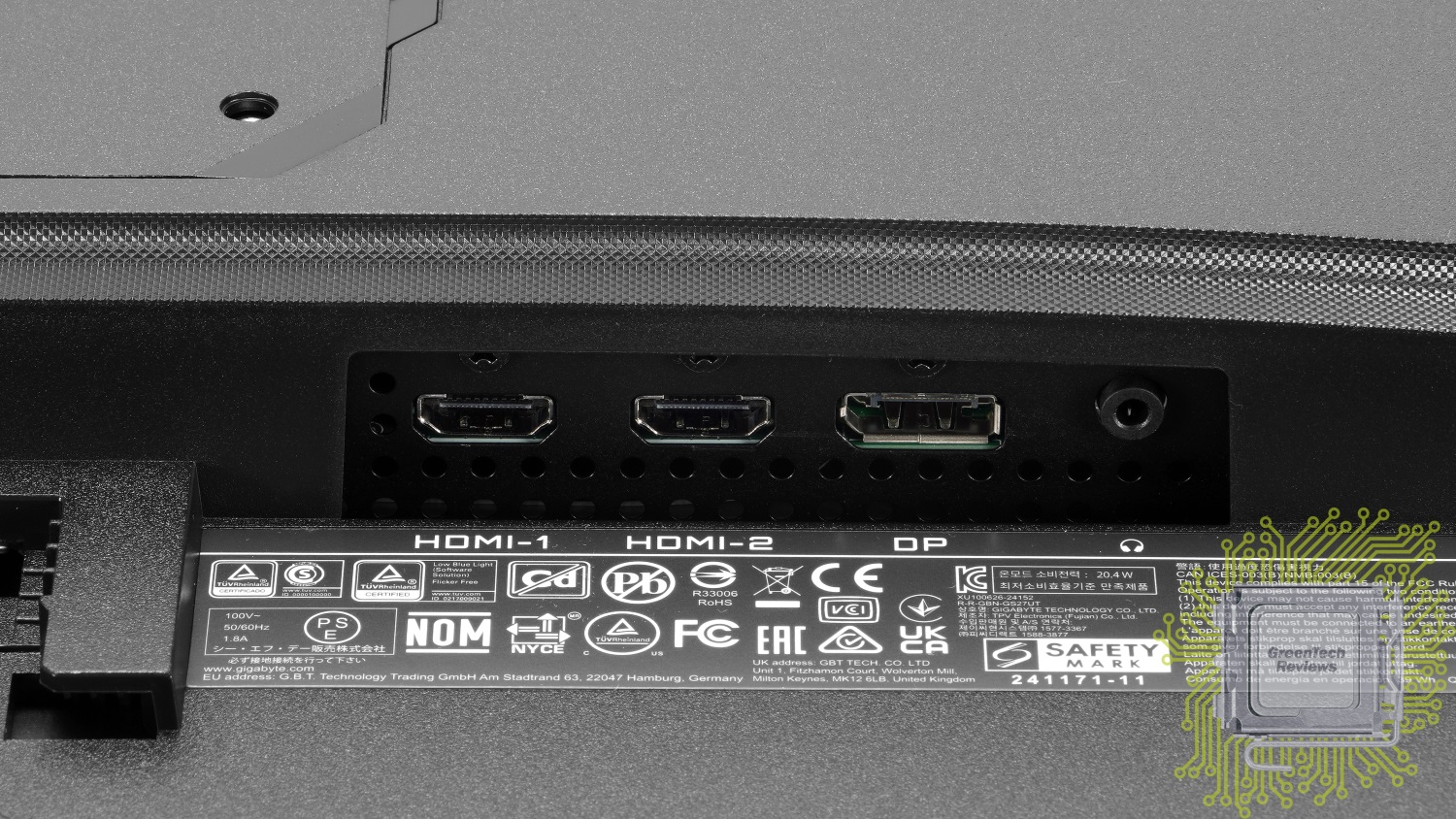 Для подключения источников видео сигнала нам доступны два HDMI 2.1 входа и DisplayPort 1.4 вход, рядом с которым расположен 3.5 мм аудио разъём.