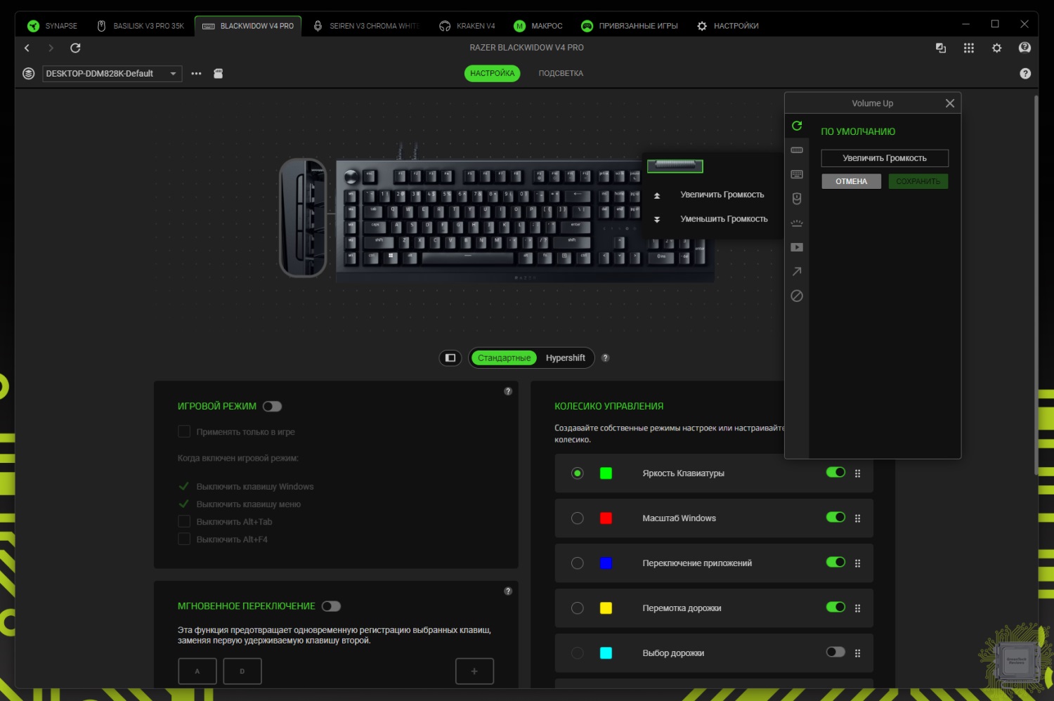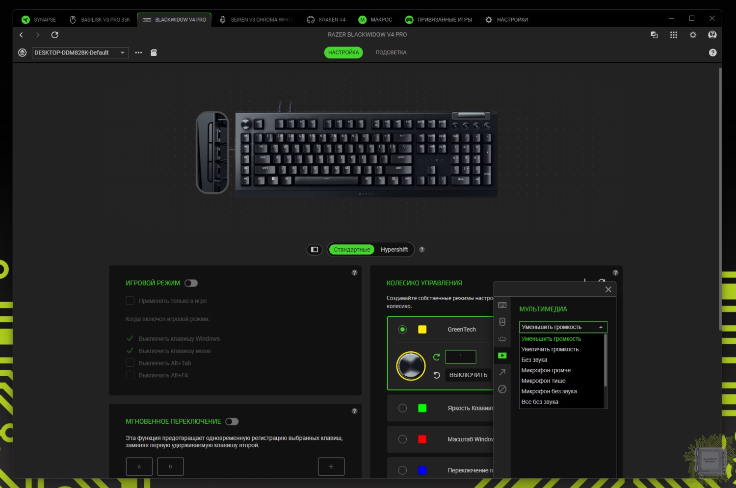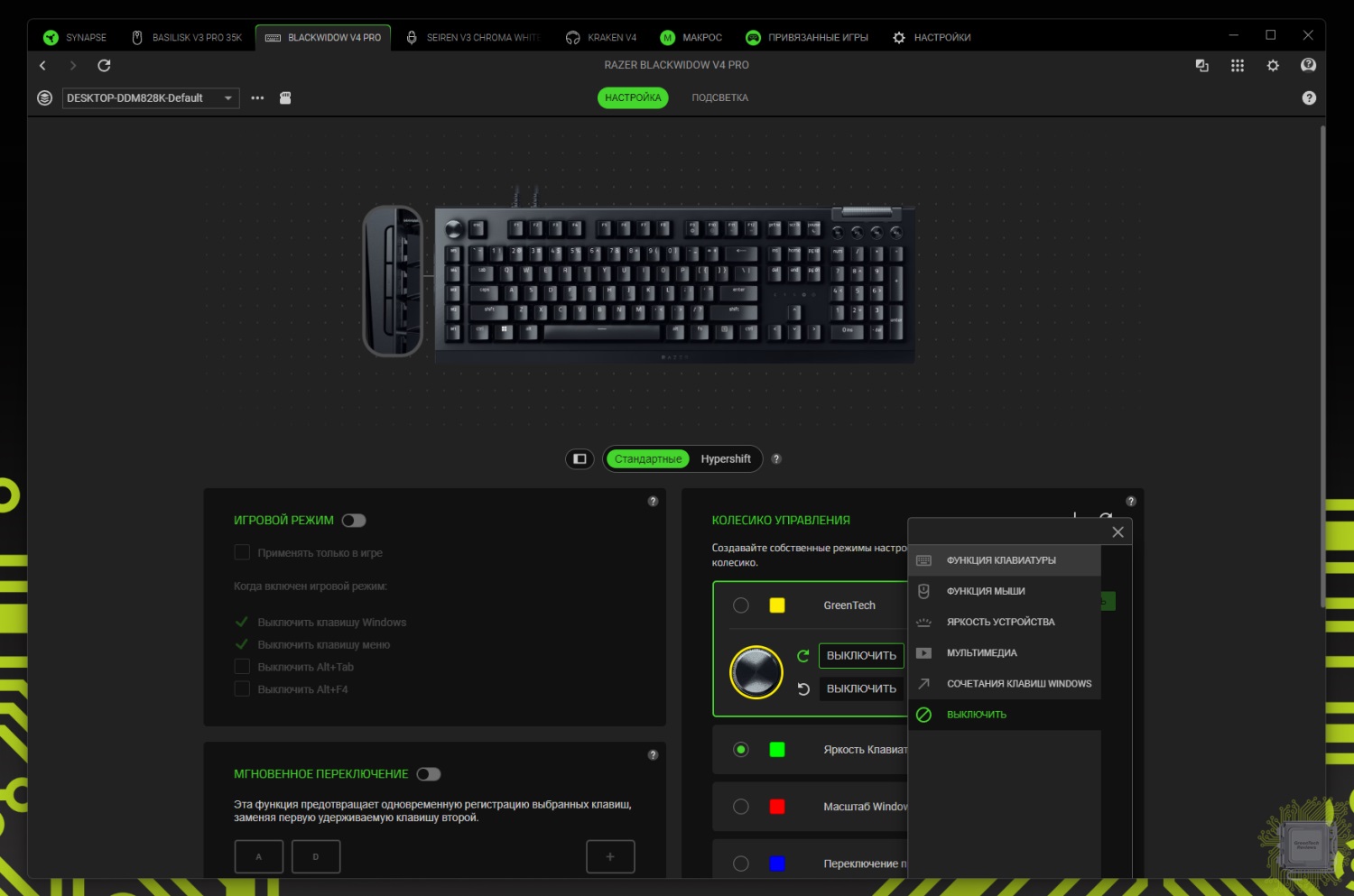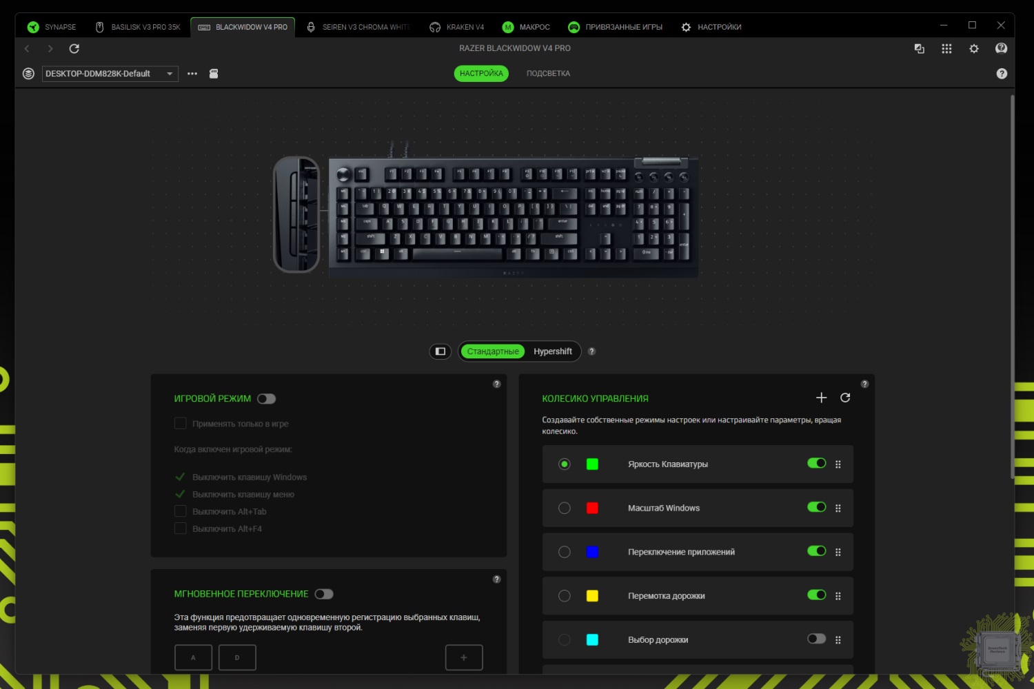 В то время как клавиатуры формата 60/65% продолжают набирать популярность, отрицать необходимость расширенного функционала полноразмерных моделей невозможно. И если стандартных полноразмерных вариантов на рынке достаточно много, то найти что-то с дополнительными клавишами или другими элементами управления — задача не такая уж и простая. Особенно если в требованиях потенциального владельца есть необходимость настроить эти клавиши по своему усмотрению. Razer Blackwidow V4 Pro — один из флагманов рынка механических клавиатур, который характерен не только первоклассной технической базой, но и продвинутым программным обеспечением. Помимо этого, производитель реализовал несколько воистину полезных функций не только для профессиональных игроков, но и для тех, кто планирует использовать эту клавиатуру и для работы с каким-нибудь программным обеспечением.