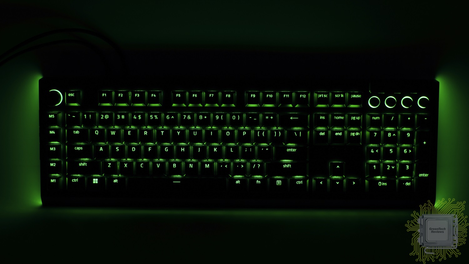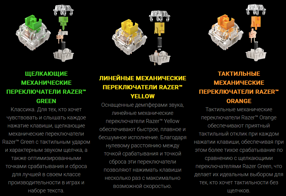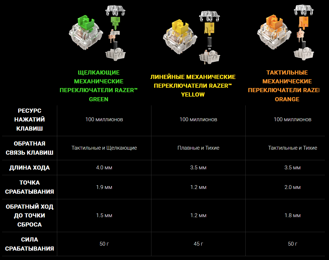 В основе клавиатуры находятся щёлкающие механические переключатели Razer Green с индивидуальным светодиодом. Высококачественный механизм позволил достичь ресурса в 100 млн нажатий. Краткая информация о всех трёх видах переключателей доступна чуть ниже (прокрутите страницу), а максимально подробную информацию с примерами звучания при просто нажатиях и при наборе текста можно найти на официальной странице этих переключателей: https://www.razer.ru/product/accessories/razer-mechanical-switches?sku=RC21-02040200-R3M1.
