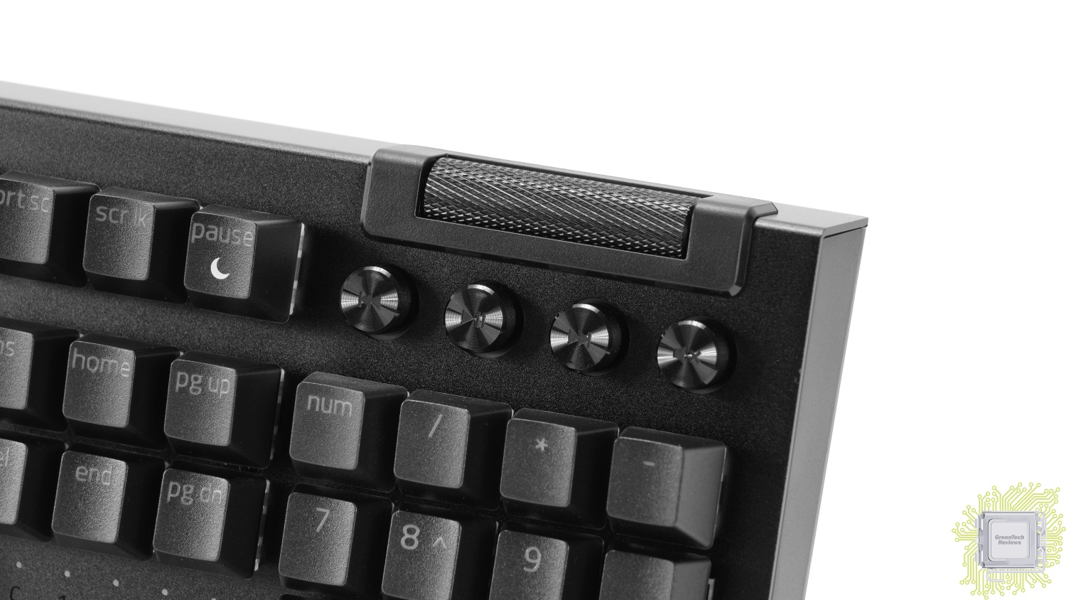 В правом верхнем углу клавиатуры размещены четыре кнопки для управления медиа контентом и горизонтальный цилиндр с рельефной поверхностью для управления уровнем громкости. Само собой, функционал этих элементов управления можно изменить.