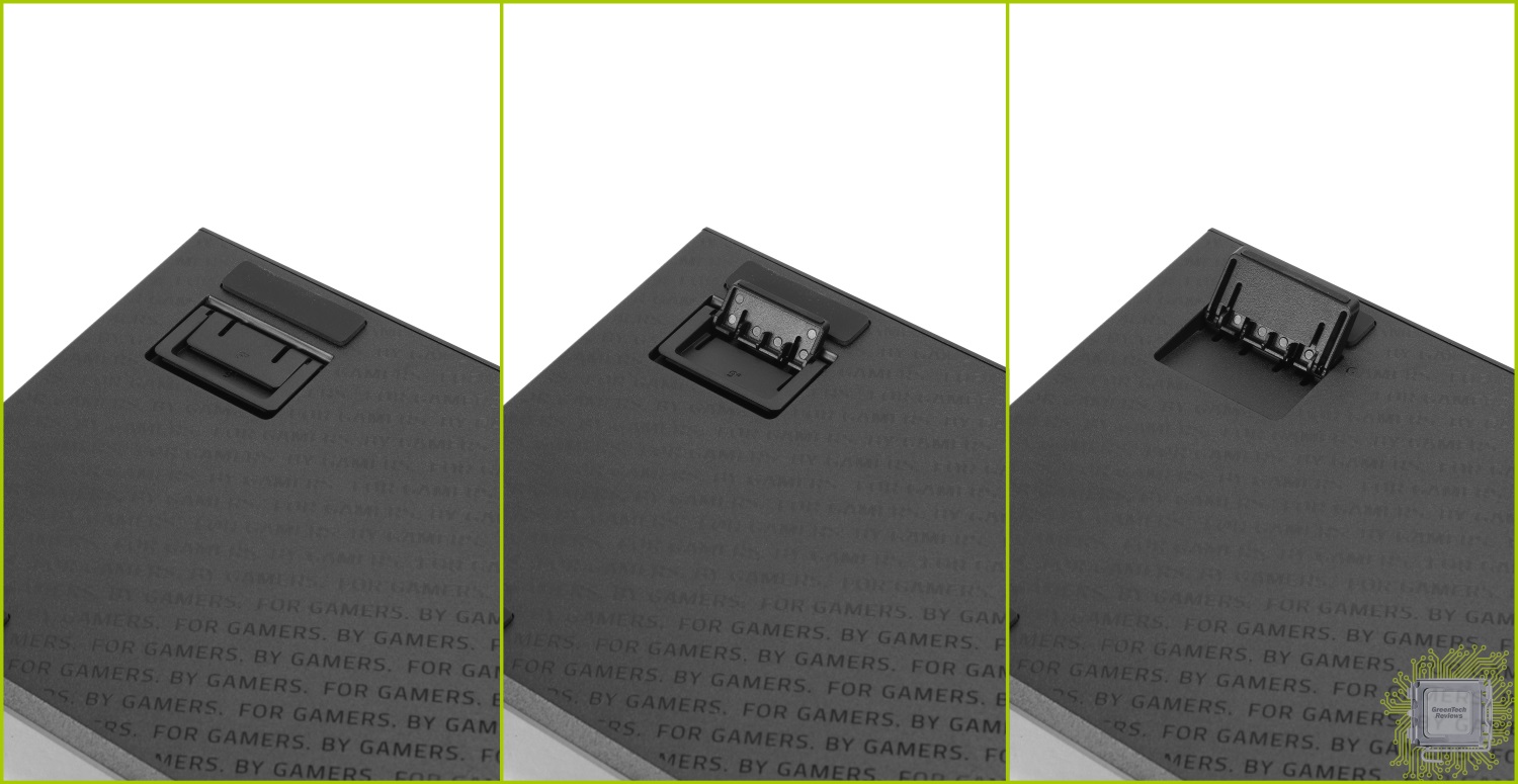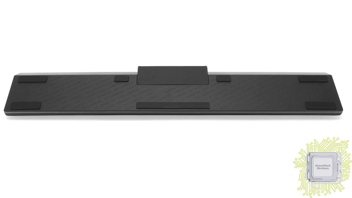 В двух углах размещены откидные ножки. Реализована пара в каждом углу. Одна увеличивает угол наклона клавиатуры на 6°, а вторая на 9°.
