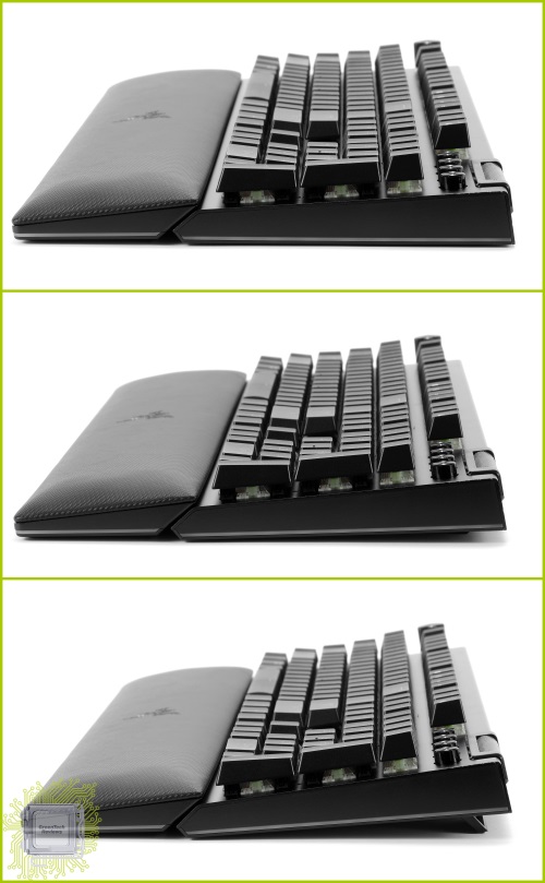 С подставкой клавиатура выглядит совсем иначе — её дизайн заметно меняется из-за округлой мягкой поверхности подставки. Сама по себе подставка очень удобная — она обладает средней упругостью и очень приятной обивкой. В отличие от ранних версий подставок (3-4 года назад), в данном случае нет эффекта «подогрева» рук при длительном использовании клавиатуры.
