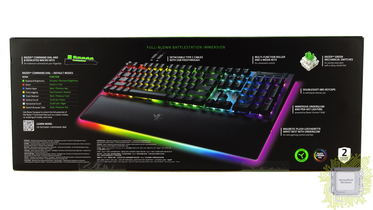 Клавиатуру вы получаете в достаточно большой коробке с фирменным оформлением Razer — в чёрно-зелёных цветах. На фронтальной стороне размещено изображение клавиатуры с включённой подсветкой и указаны её ключевые особенности: указан тип переключателей, о которых мы ещё поговорим отдельно; интересная реализация подсветки не только клавиш, но и корпуса клавиатуры; наличие цифрового колеса управления и восьми выделенных для программирования клавиш; наличие ещё одного колеса и четырёх медиа клавиш.