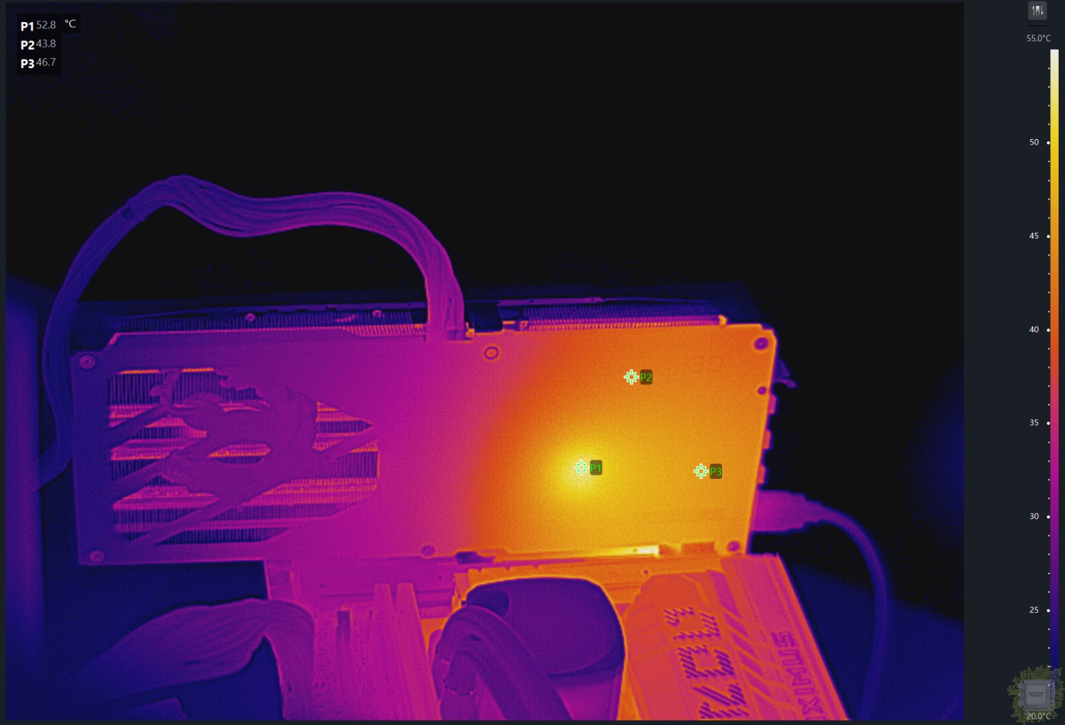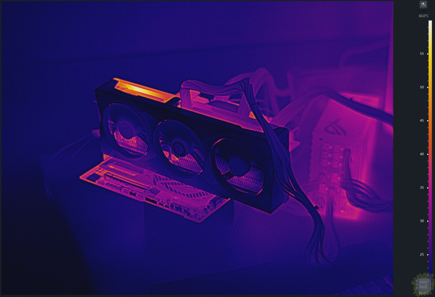 Если посмотреть на видеокарту тепловизором, то картина складывается следующая. Общий вид на тестовый стенд: