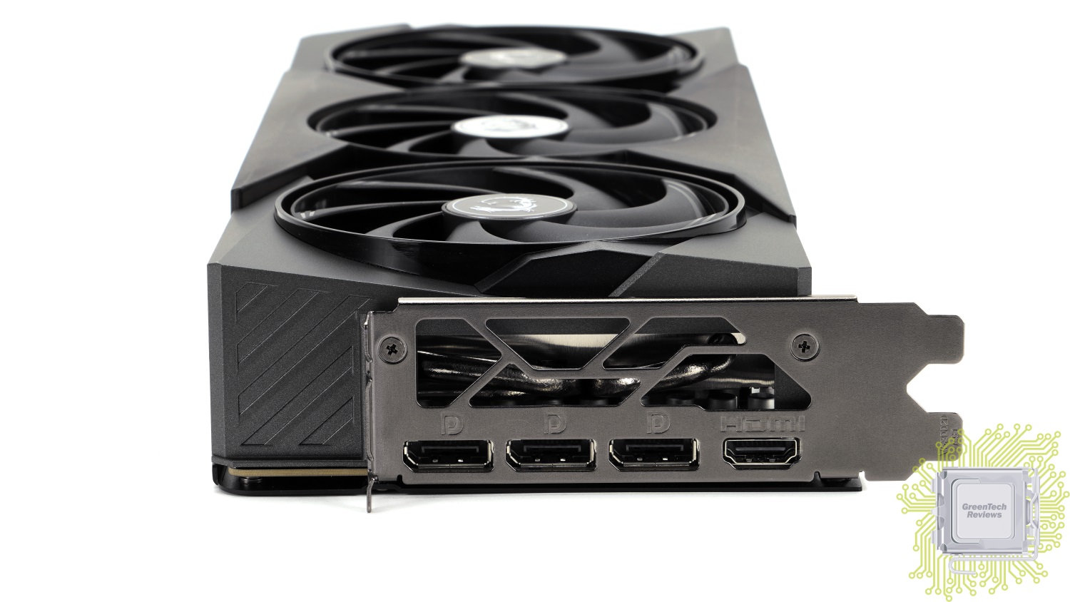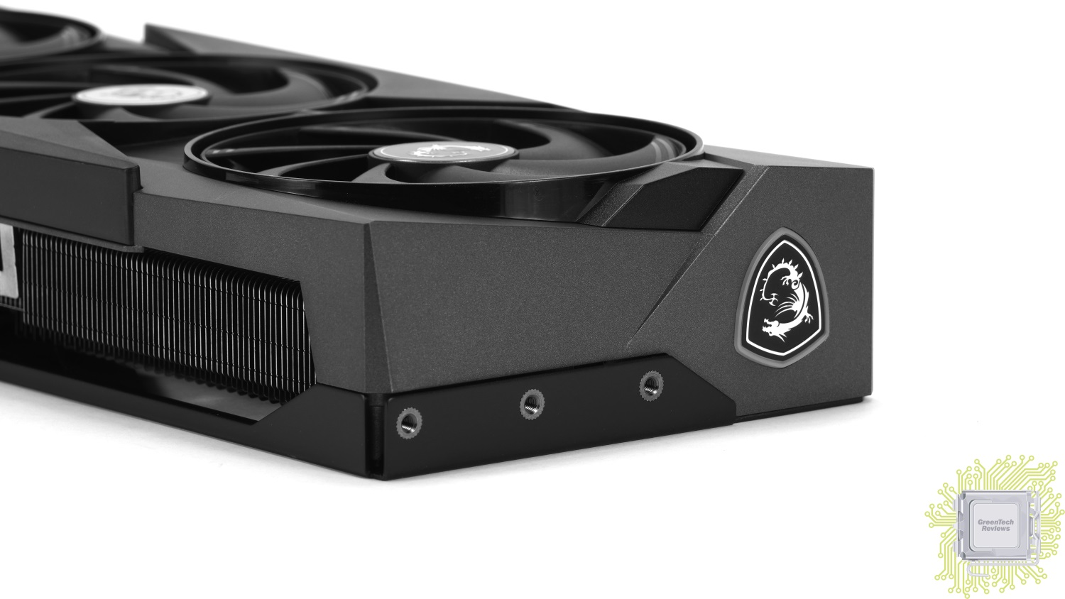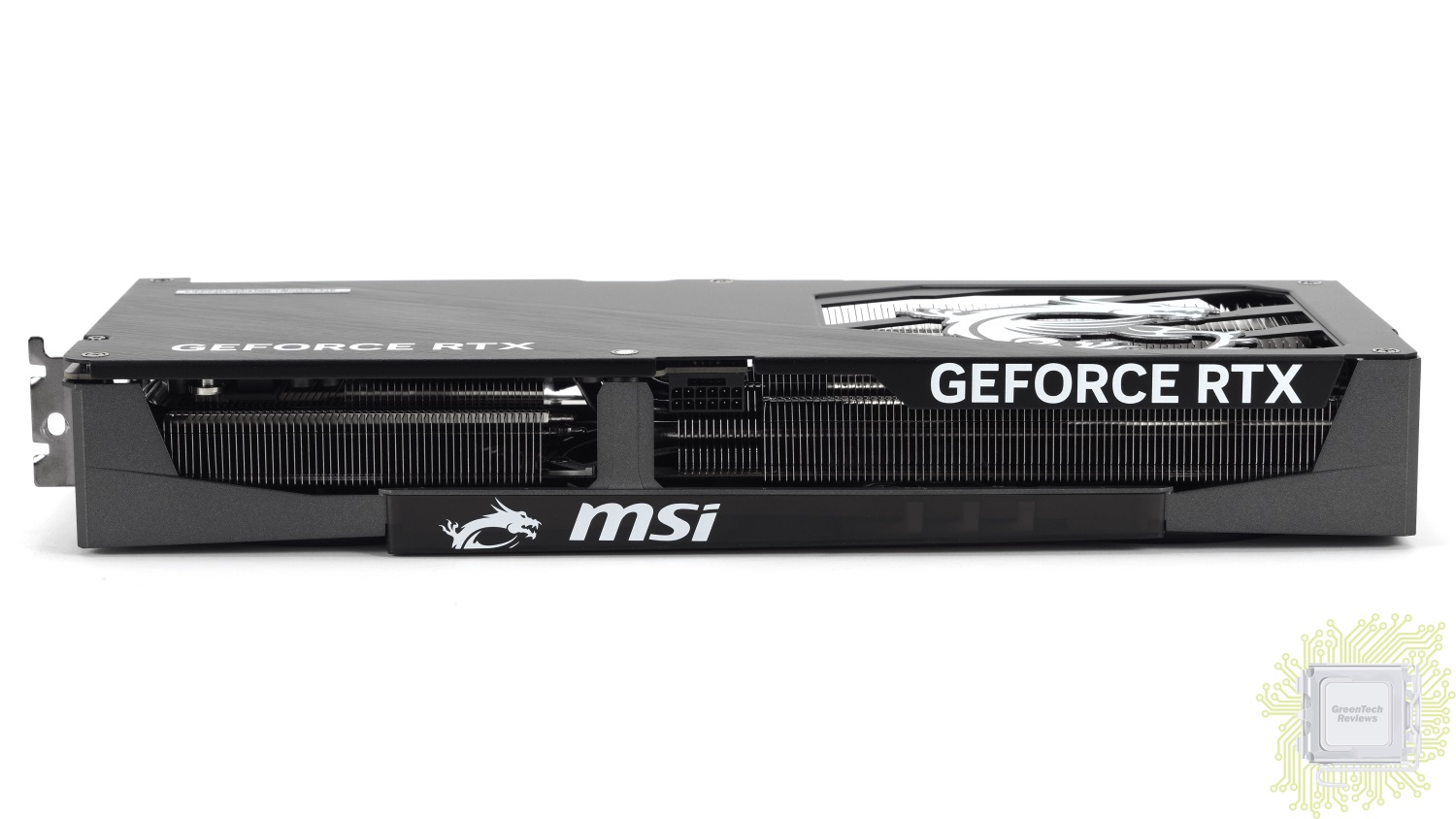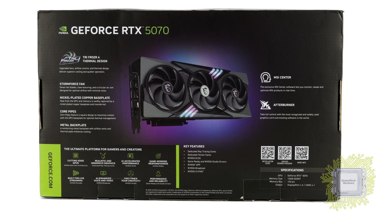 На обратной стороне производитель разместил информацию о ключевых особенностях модели, в число которых вошли система охлаждения Tri Frozr 4 и вентиляторы Stormforce, металлический бэкплейт, а также совместимость с программным обеспечением MSI Center и MSI Afterburner.