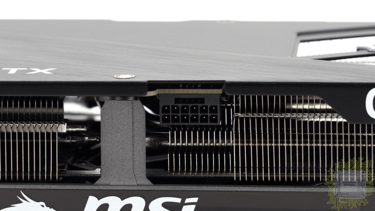 Дизайн видеокарты выдержан в стиле MSI — это видно как по форме кожуха системы охлаждения со светящимися вставками, так и по конструкции радиатора, а именно — форме теплораспределительных пластин.