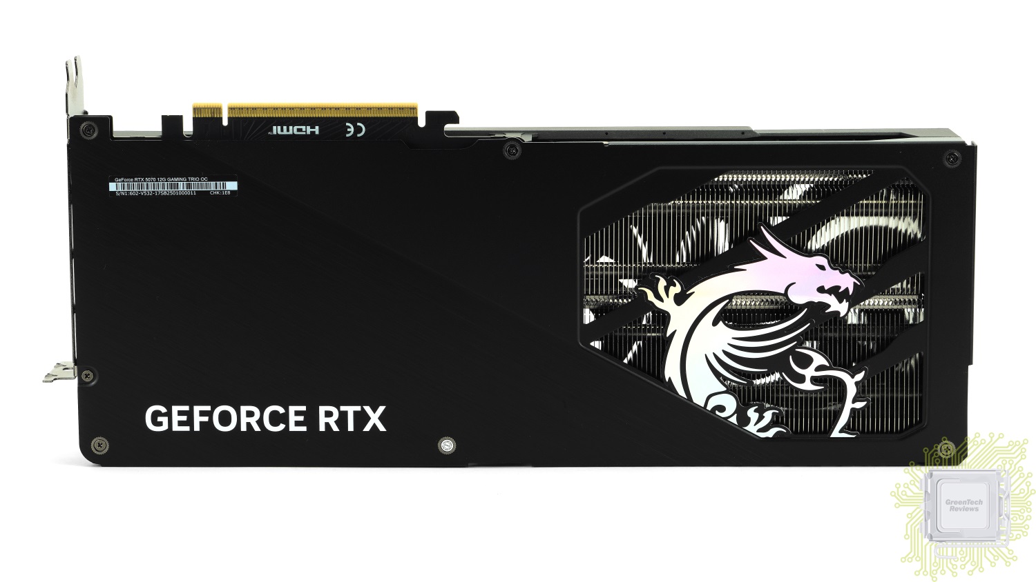 Практически всю обратную сторону печатной платы закрывает металлический бэкплейт. Вне печатной платы в бэкплейте реализовано «окно» с фирменным логотипом производителя, чтобы радиатор продувался насквозь, тёплый воздух поднимался и выдувался корпусными вентиляторами за пределы корпуса.
