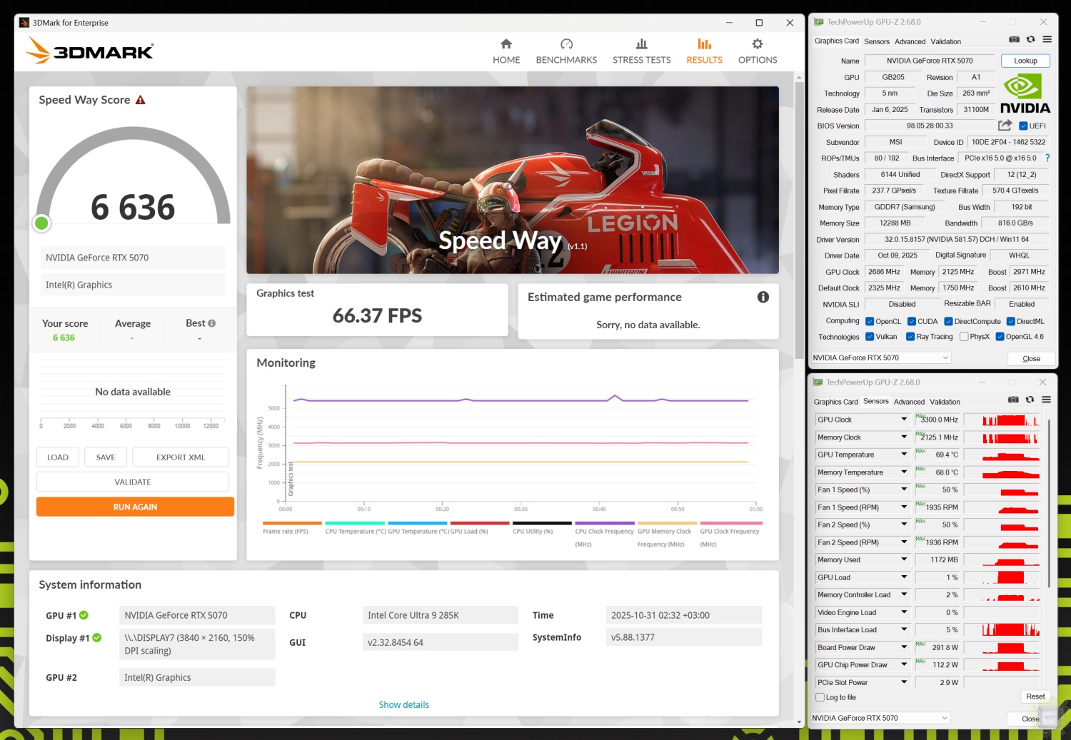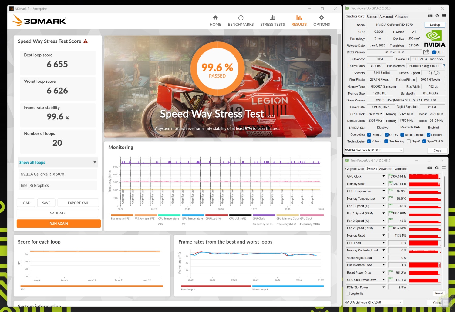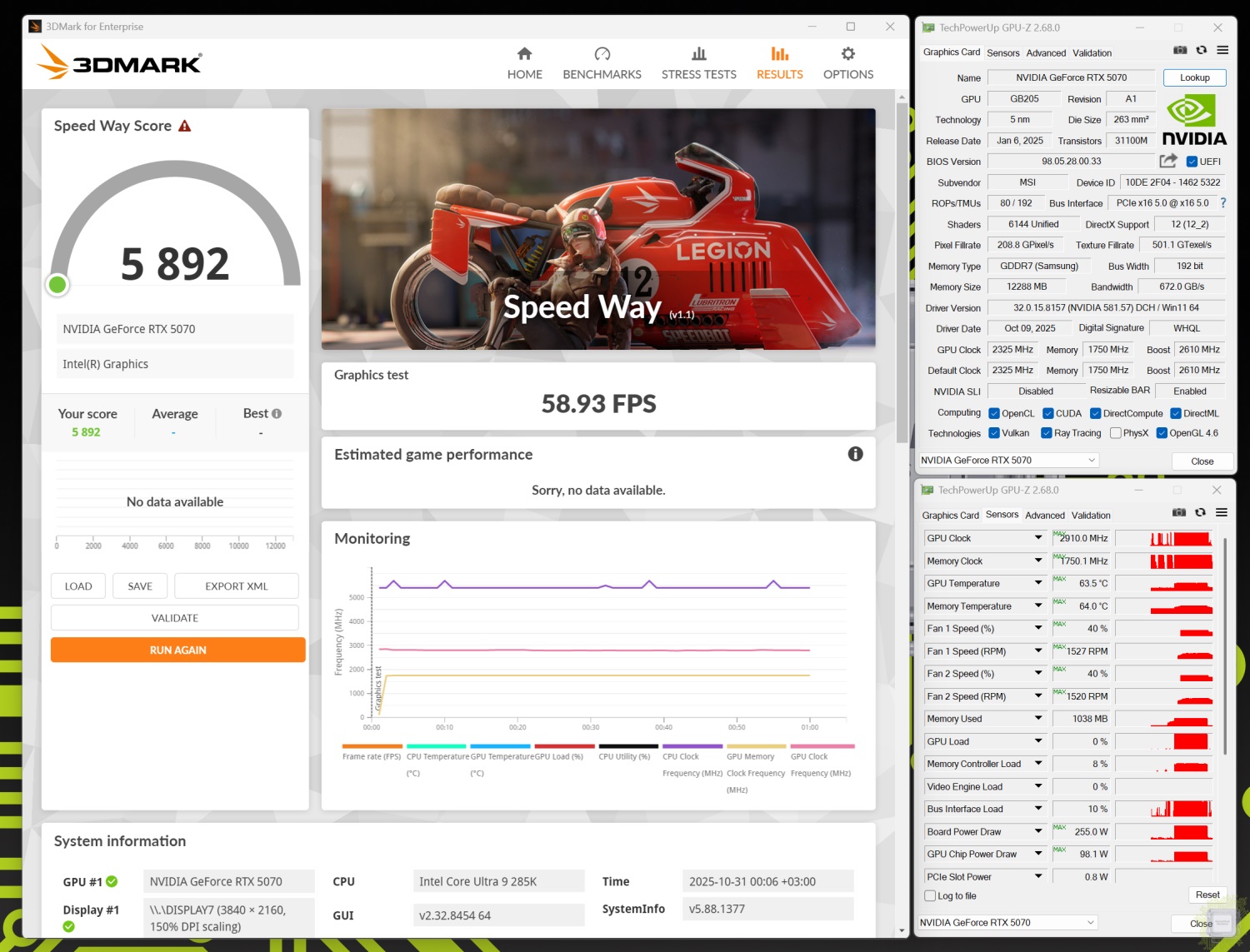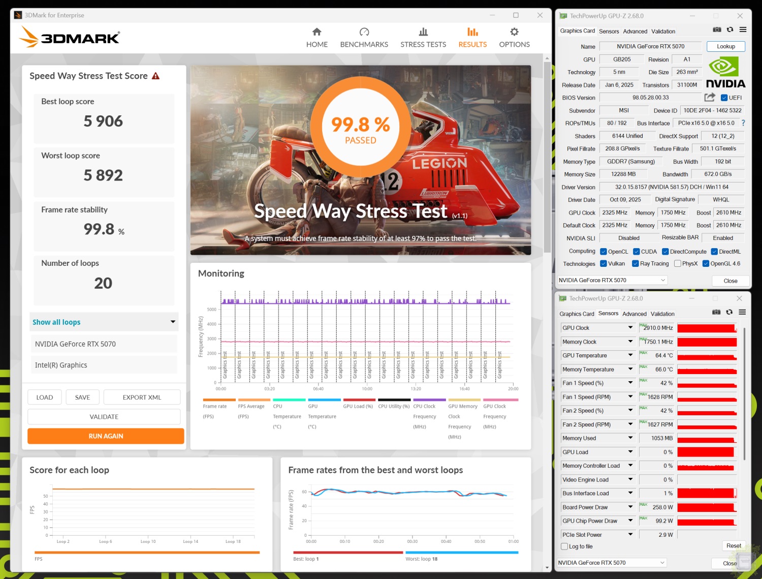 Пример замера производительности в графическом тесте 3DMark Speed Way. Номинальный режим. Частота графического процессора достигает 2910 МГц при TDP в районе 98 Вт (255 Вт для всей видеокарты).
