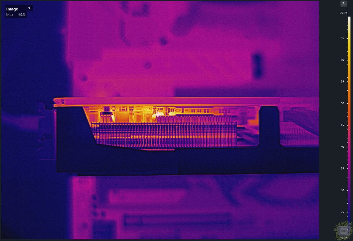 Если попробовать заглянуть внутрь системы охлаждения, то ничего критичного выявить тоже не удалось — температура в области подсистемы питания составила менее 70°С (само собой, ближе к центру будет выше, но всё в рамках допустимого).