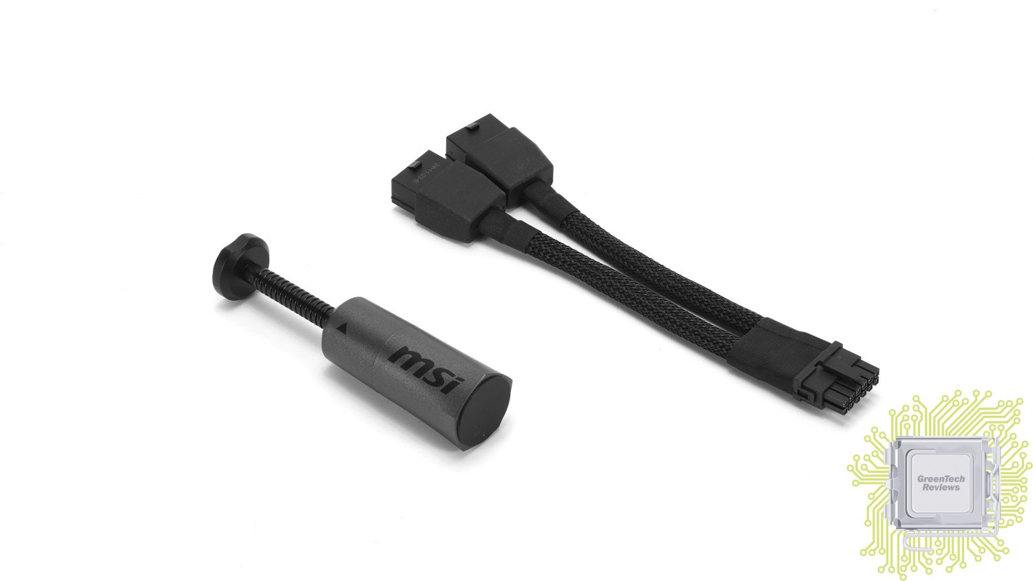 Кроме бумажной составляющей в комплекте поставки присутствуют два важных аксессуара — переходник питания с двух 8-контактных классических кабелей на один 16-контактный и подставка для видеокарты с изменяемой высотой поддержки.