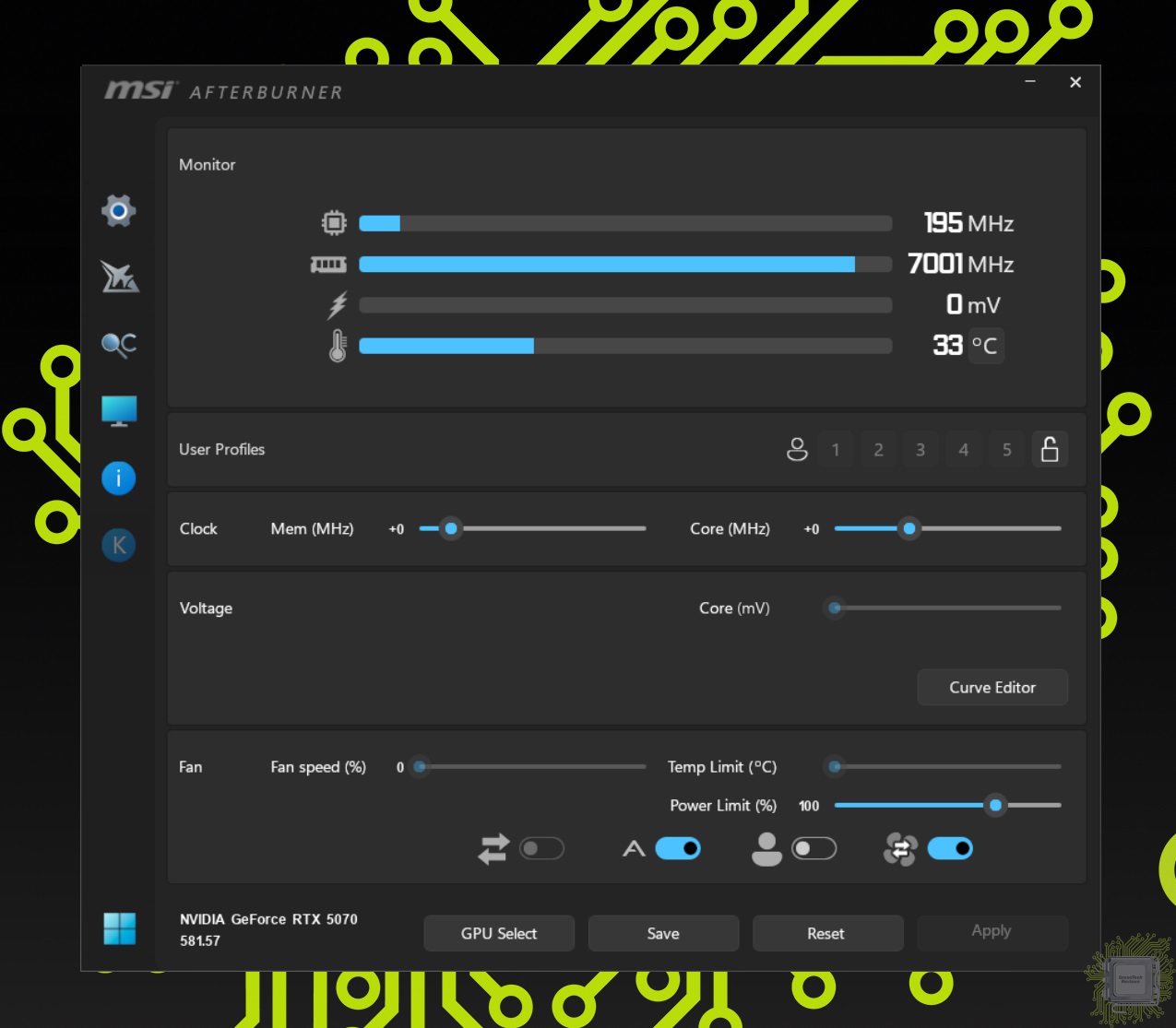 MSI Afterburner является одной из лучших программ для настройки видеокарты, что обусловлено богатым функционалом. Реализованы не только настройки вентиляторов, лимита энергопотребления и частоты, но и более продвинутые возможности. Например, кривая частоты/напряжения. Отдельное окно реализовано для мониторинга многих показателей видеокарты (и не только её).