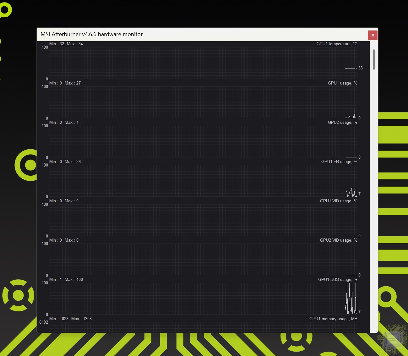 По разгону ситуация следующая. При помощи MSI Afterburner удалось добиться работы видеокарты на частоте 3300 МГц для графического процессора и 2125 МГц (34 ГГц) для видеопамяти. Прирост производительности в таком режиме составляет до 10% в зависимости от сценария использования видеокарты. Энергопотребление в таком режиме возросло до 292 Вт (вся видеокарта), из которых графический процессор потреблял около 112 Вт.