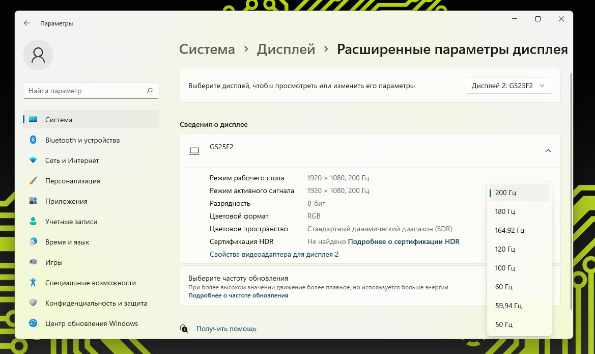 В отличие от практически всех остальных мониторов производителя, модель GS25F2 позволяет выбрать частоту обновления в достаточно большом диапазоне значений — от 50 до 200 Гц.