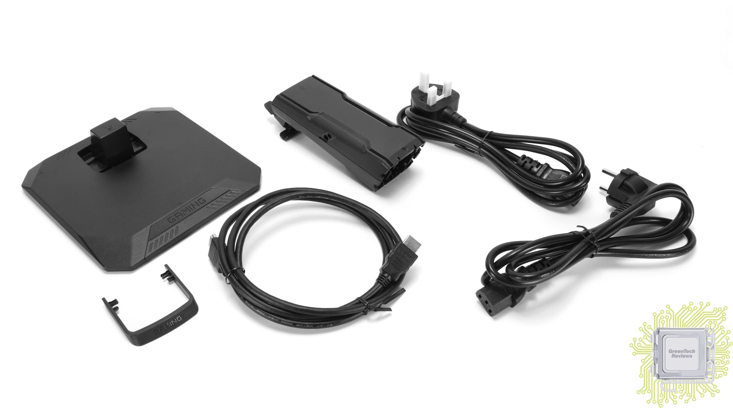 Комплект поставки включает в себя руководство пользователя, силовые кабели двух типов, HDMI кабель, подставку в разобранном виде и фиксатор для кабелей, который крепится к вертикальной части подставки. Первое, что сразу замечаешь — основание подставки и сама подставка целиком выполнены из пластика. Из металла — механизм крепления к корпусу монитора.