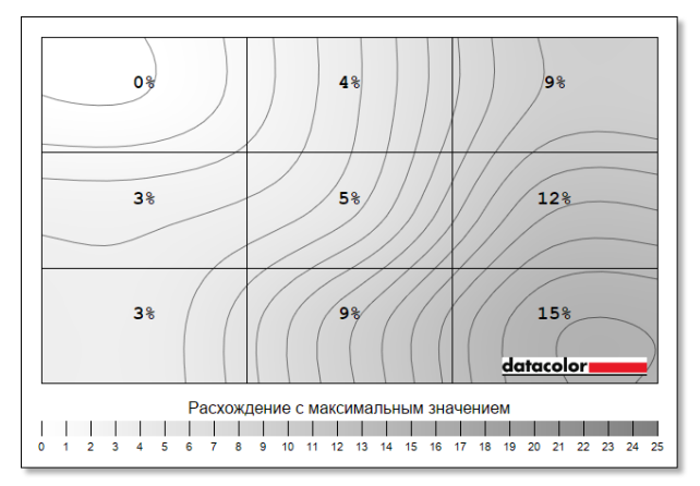 Максимальное отклонение яркости зафиксировано на отметке 15%, что можно назвать нормальным результатом. При заявленном значении 300 кд/м2 по результатам измерений было получено около 290 кд/м2.
