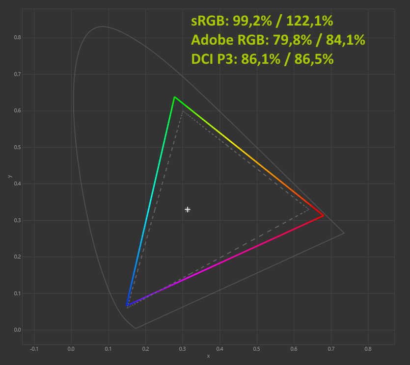 При стандартных настройках дисплей соответствует sRGB на 99,2% (полный охват — 122,1%), Adobe RGB на 79,8% (полный охват — 84,1%) и DCI P3 на 86,1% (полный охват — 86,5%). Здесь никаких вопросов — заверения производителя о 120% для sRGB подтвердились полностью.