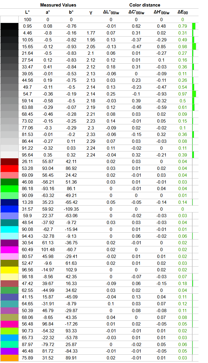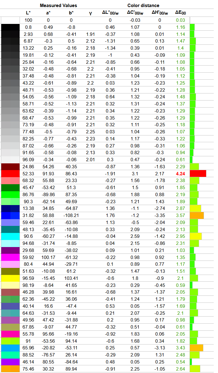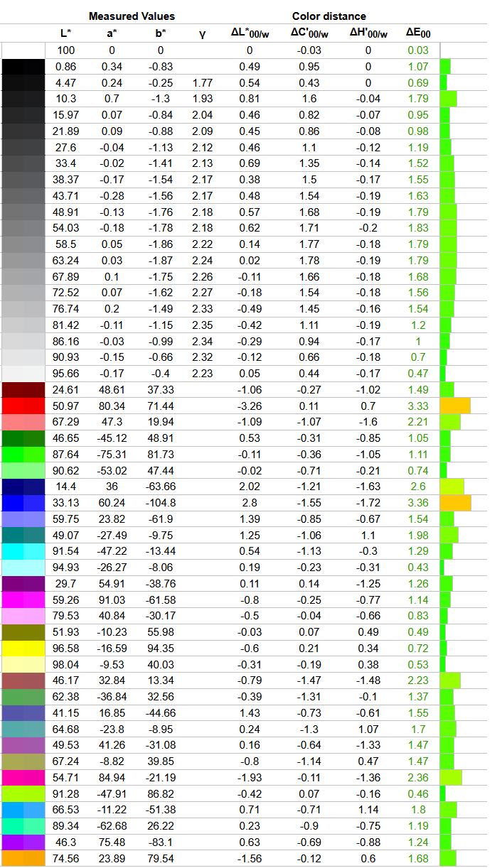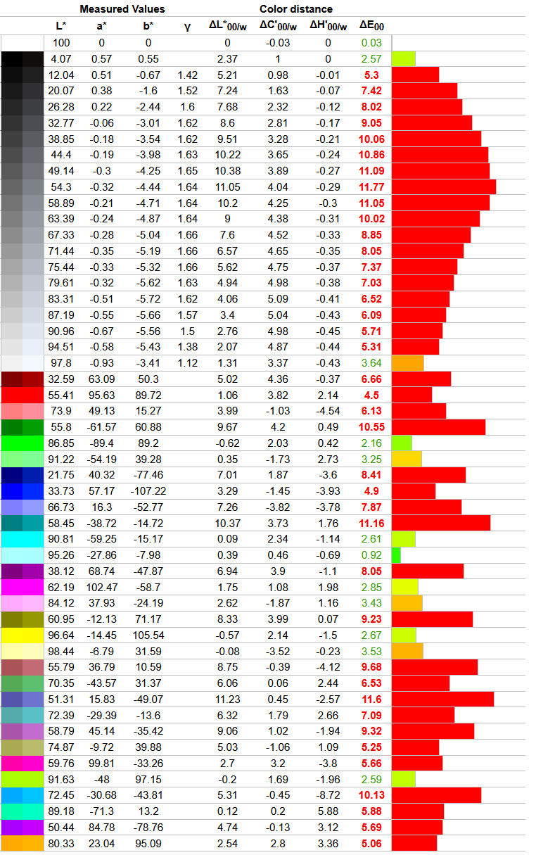 Что касается отклонений цветопередачи, то мы получили такие результаты. Напомним, что очень хорошими результатами являются показатели отклонения DeltaE (среднее значение) менее единицы, а максимальное отклонение DeltaE – менее трёх.