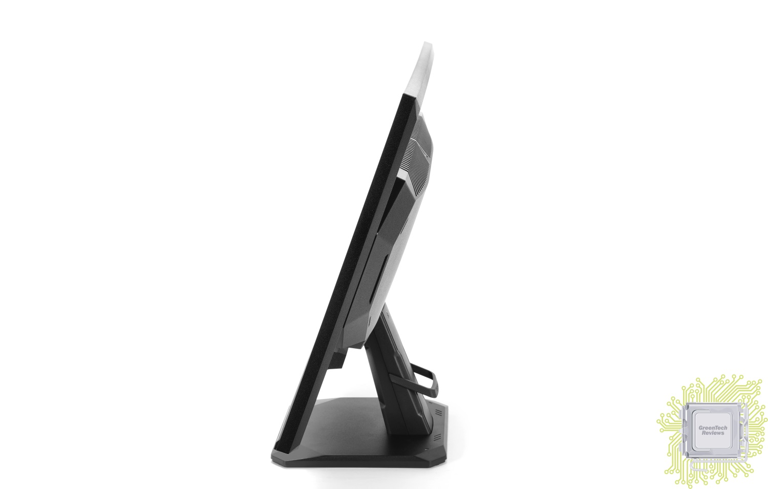 Подставка тоже лишена некоторого функционала, а именно — регулировки по высоте и повороту относительно основания. Регулировка экрана доступна по углу наклона дисплея относительно стола. Минимальный угол составляет минус 5°, что выглядит следующим образом: